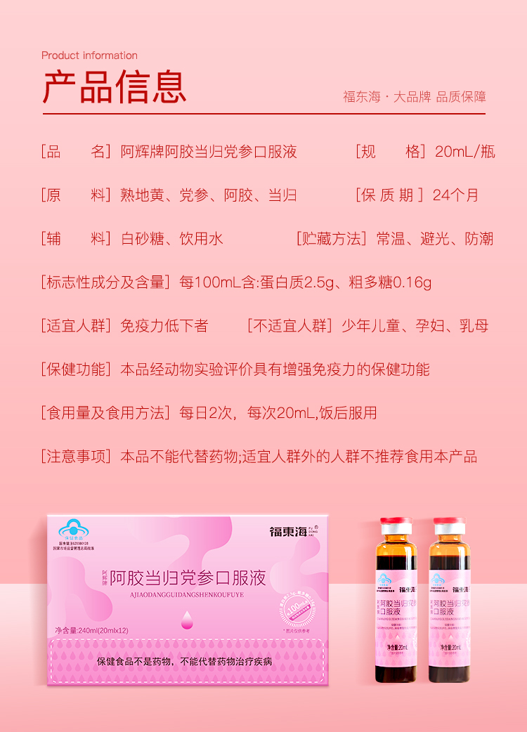 【福东海】阿辉牌阿胶当归党参口服液 240ml/盒 FDH08010021