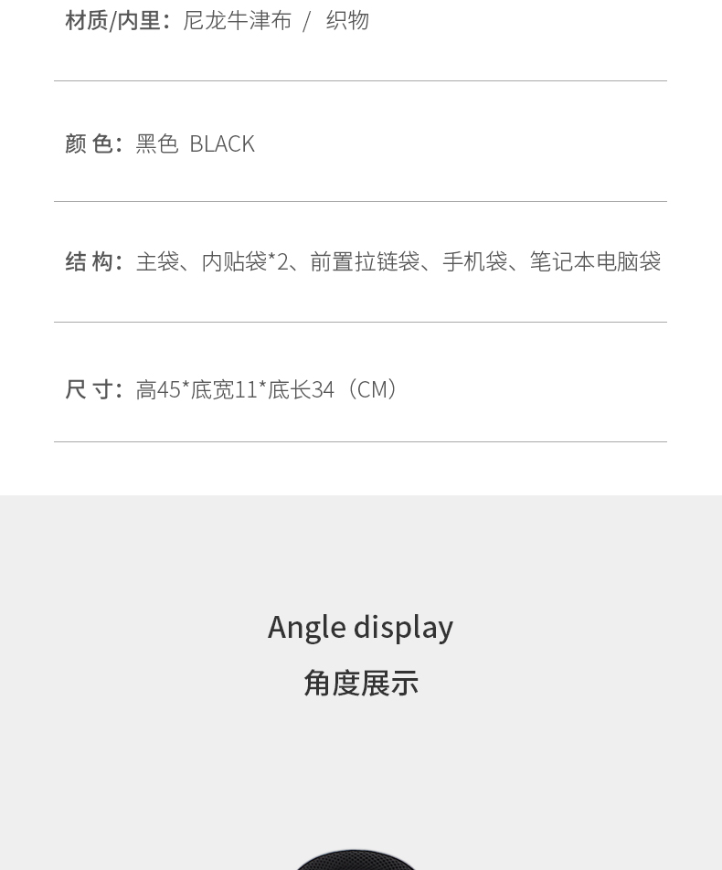 精选牛津布,高密度、耐磨,背部立体透气缓冲垫快速散热并保持凉爽,加固手提缓解压力,优质五金激光品牌LOGO,精致五金配件;侧边联系信息插位,前置拉链袋两个,多功能小插袋两个,内附主袋、电脑夹层、轻松装纳日常,适合更多消费者