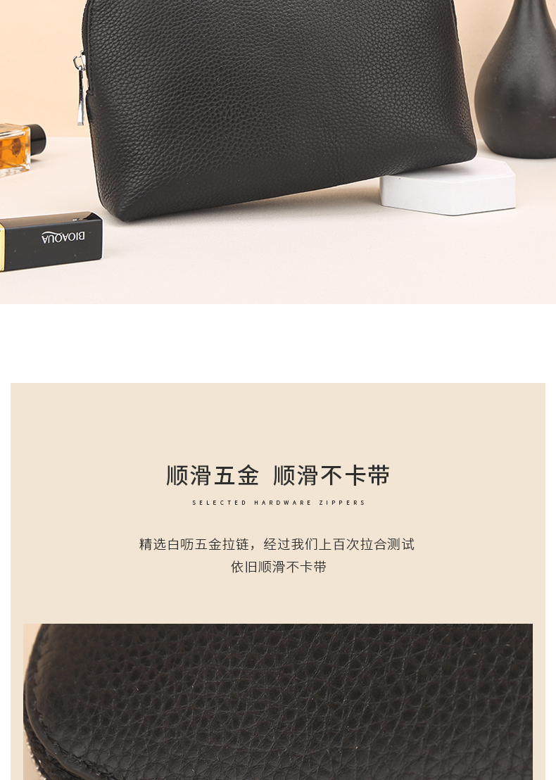 手包面料精选纹理清晰细腻柔软的头层牛皮,优质的五金配件顺滑的拉链来回自如!内格撞天蓝色超纤,耐用,内设3卡位.简于优雅!