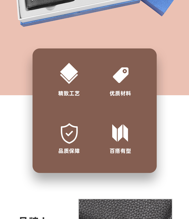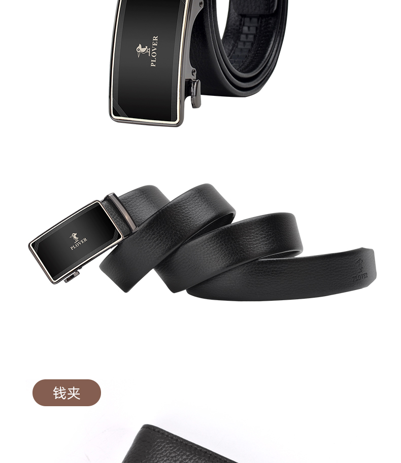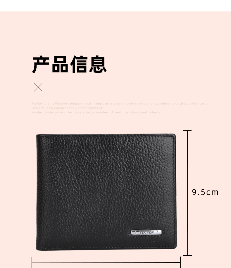 钱包采用头层牛皮制作,手感细腻,大面装品牌LOGO金属,带身采用PVC耐磨料,带身压印品牌LOGO,工艺采用内车线工艺,扣头采用锌合金真空电镀,亚克力磨砂片贴片,弹簧自动装置,实用更便捷
