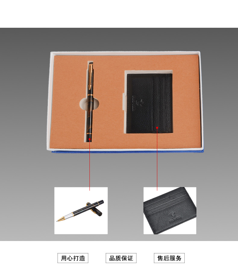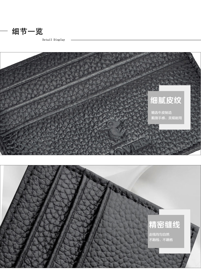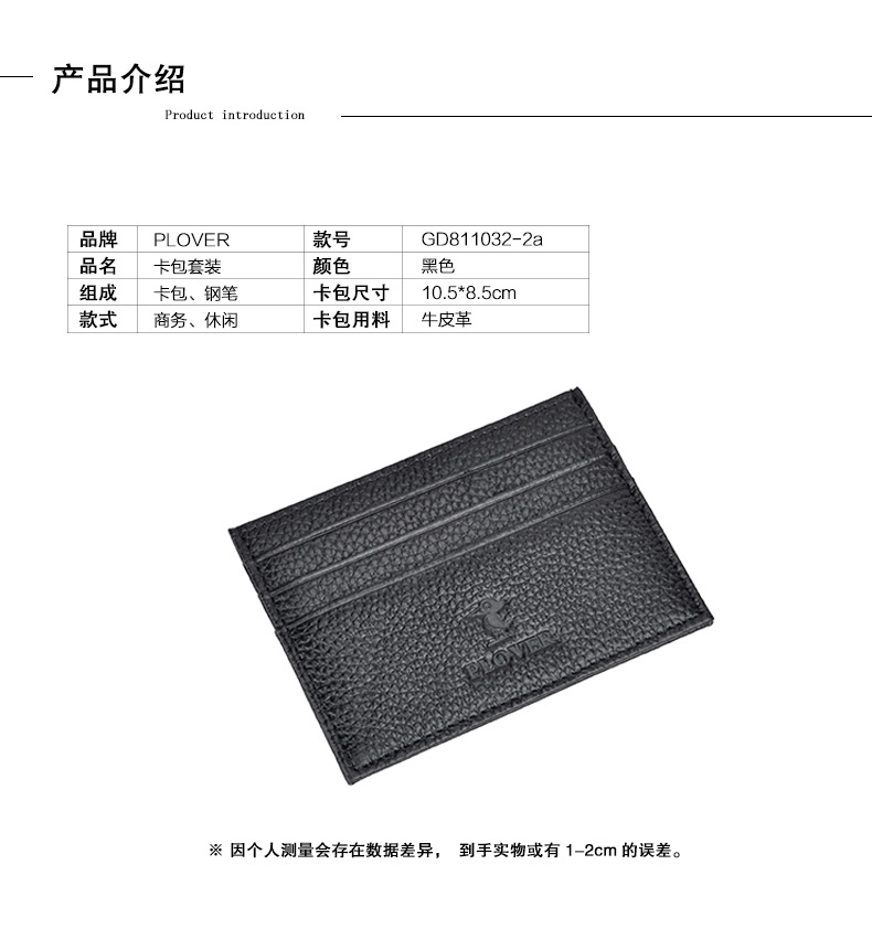 采用特优级头层牛皮制作,皮纹清晰而精细,柔软舒适且不易变形;精准的压印工艺,不溢出,不含糊,菱角分明;正反双面各3个卡位,中间零钱位,此款卡包主打轻巧纤薄,便携简约;金属笔芯钢笔高端大气;