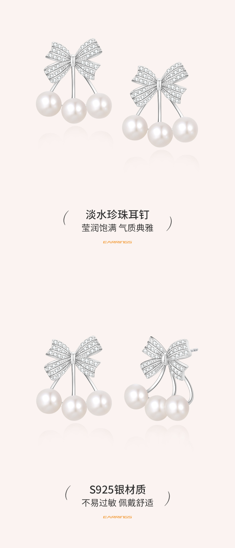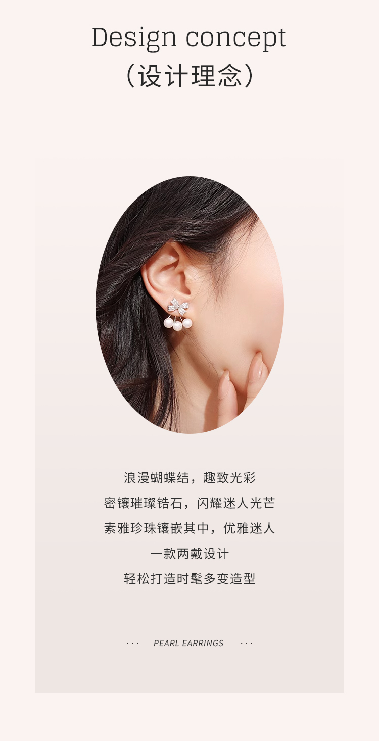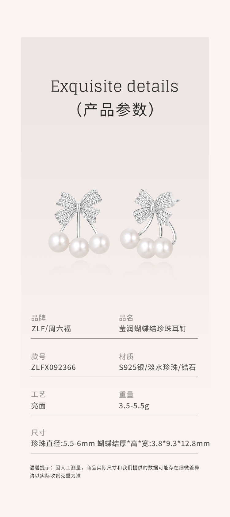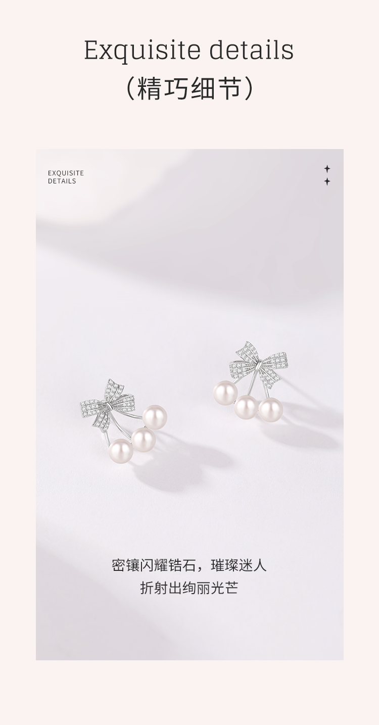 周六福S925银莹润蝴蝶结珍珠耳钉 ZLFX092366