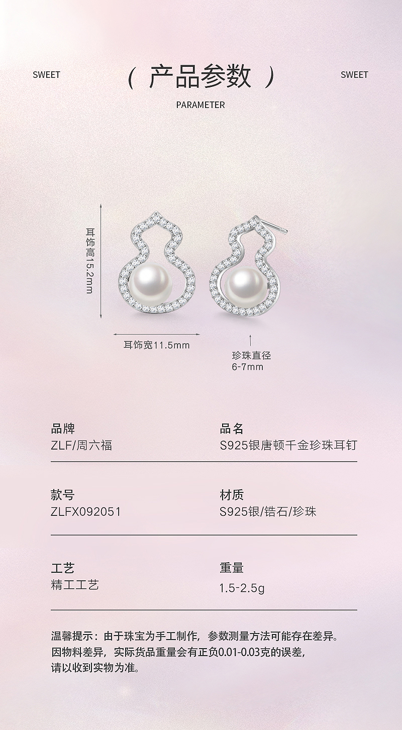 周六福S925银唐顿千金珍珠耳钉 ZLFX092051