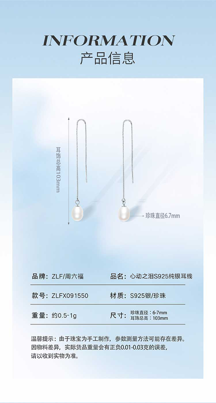 周六福心动之泪S925纯银耳线 ZLFX091550