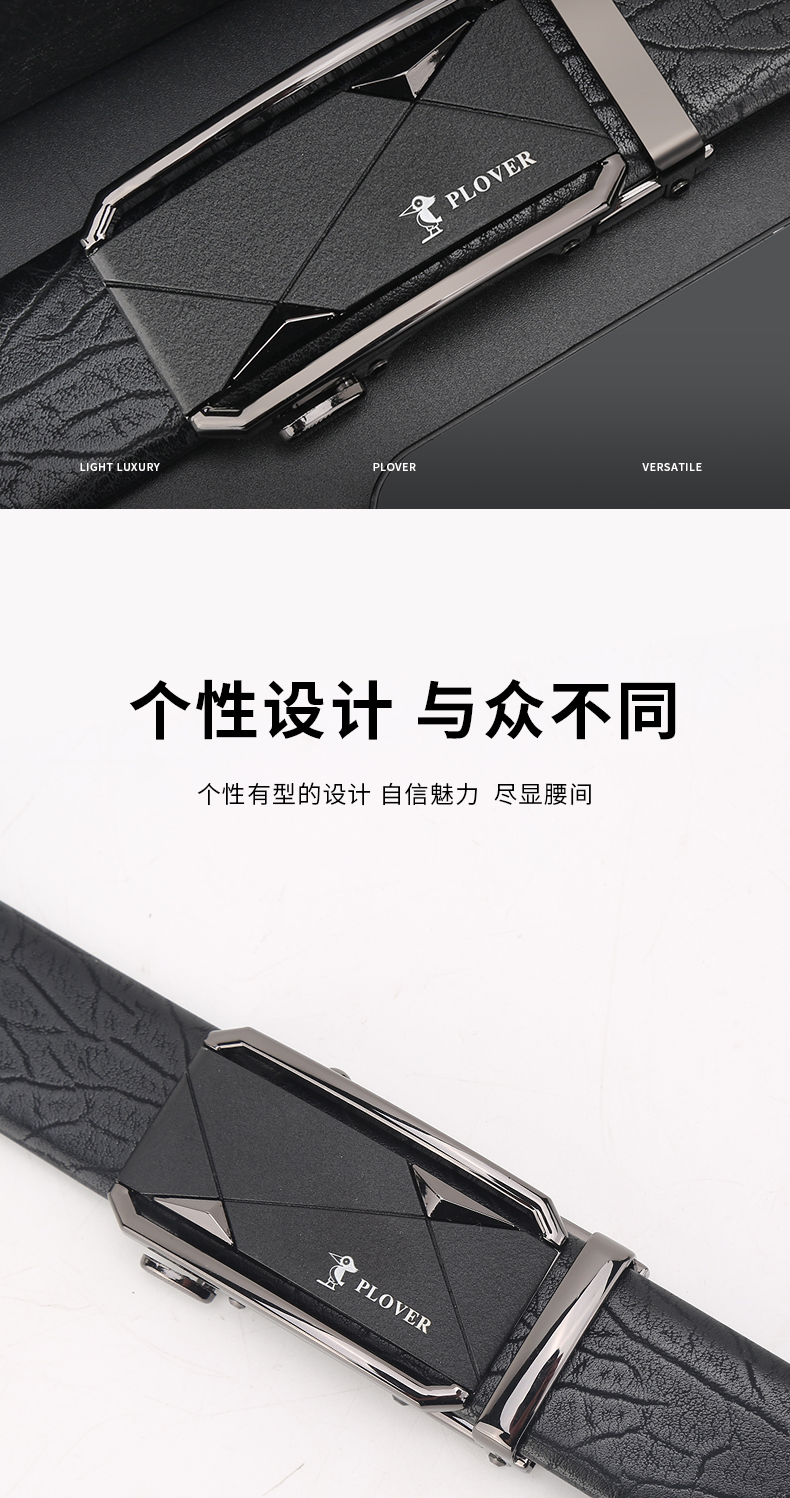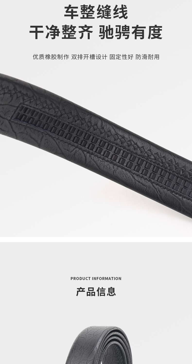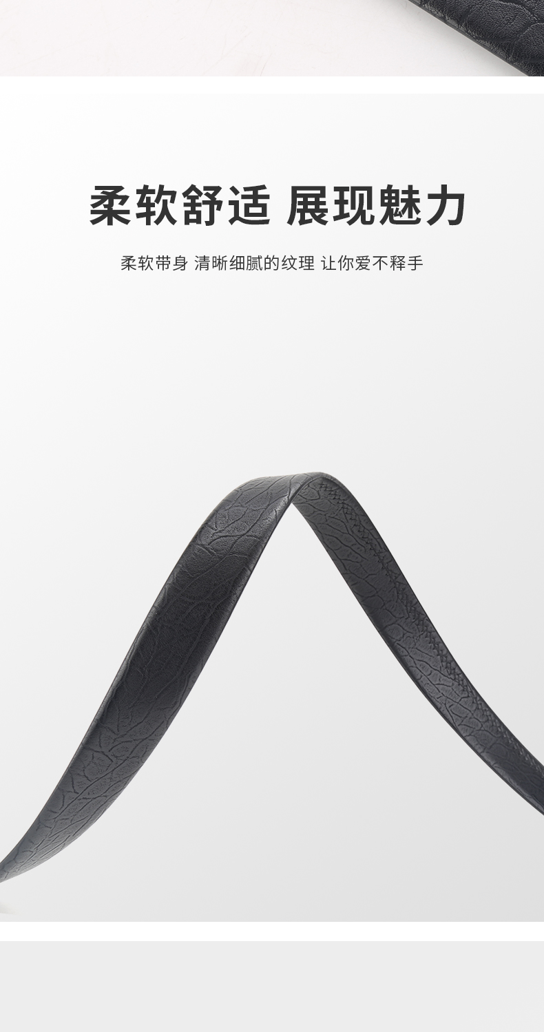 带身手感柔软耐用,纹理精致细腻。扣头采用锌合金真空电镀工艺,两边镂空设计新颖!隐藏式车线工艺,高温耐变形夹层,产品紧实,环保,更耐用!