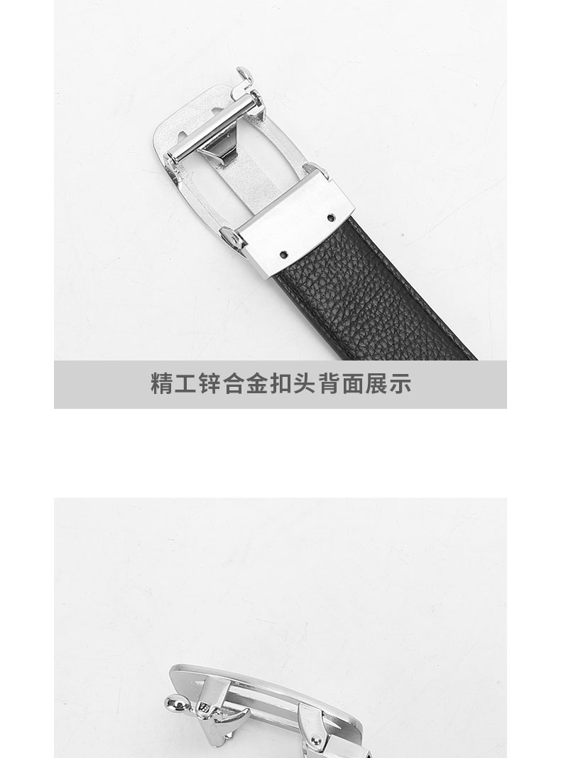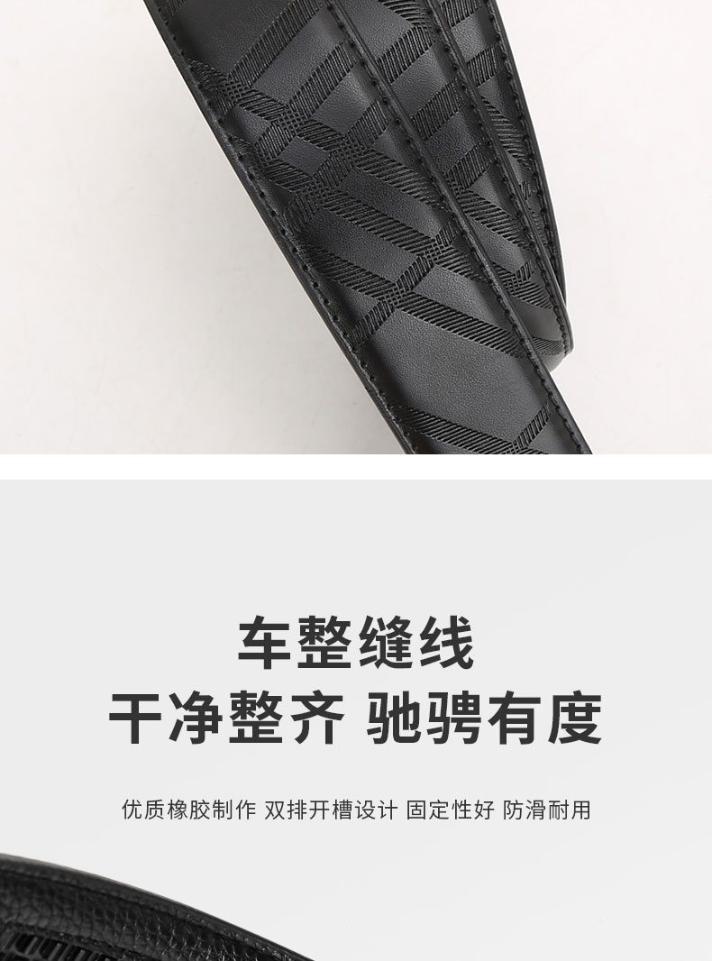 皮带采用耐磨PU革、不易断裂、压花工艺,条纹清晰,内部采用高强度防变形夹心,休闲时尚,搭配中间镂空椭圆扣头,高端大方