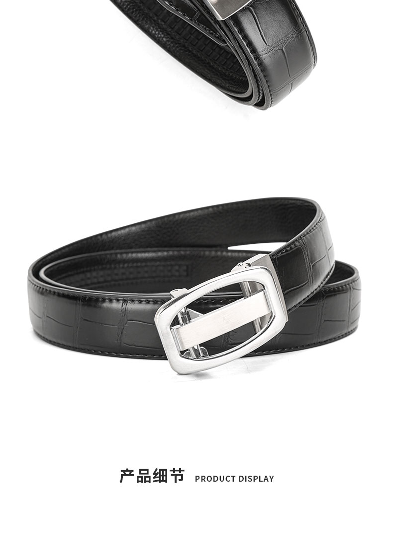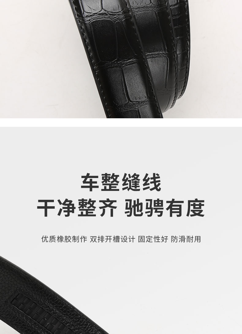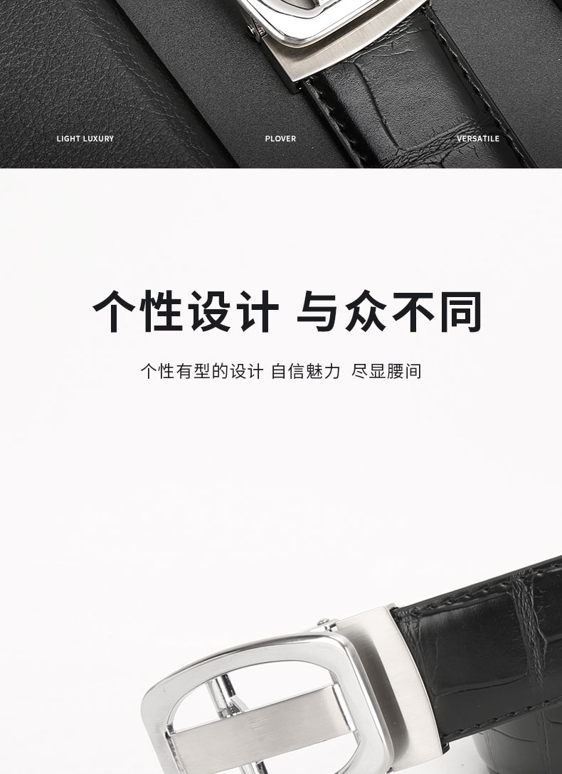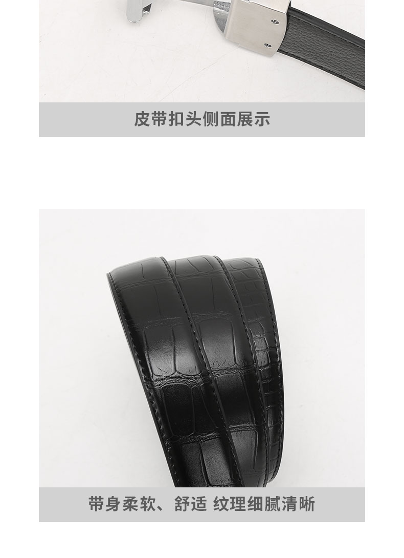 皮带采用耐磨PU革、不易断裂、压花工艺,防鳄鱼纹路,内部采用高强度防变形夹心,休闲时尚,搭配中间镂空椭圆扣头,高端大方