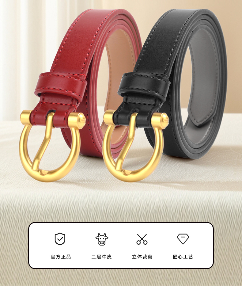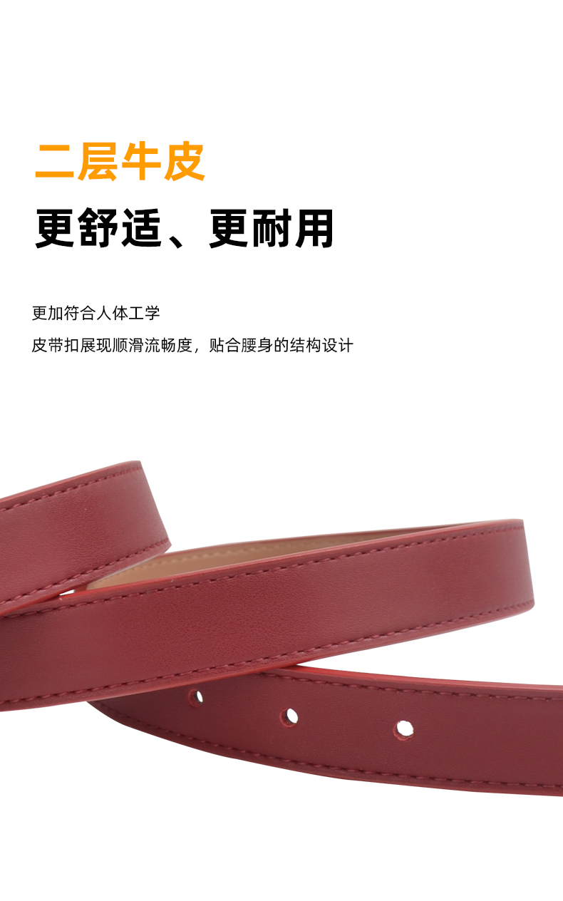 本品采用精选合金扣头,色泽柔美,优雅耐看,柔软的牛剖层带身,手感好,韧性强,耐拉耐磨不变形,是一款颜值与品质共存的经典版型,配有精美礼品盒,更显产品的档次和内涵。