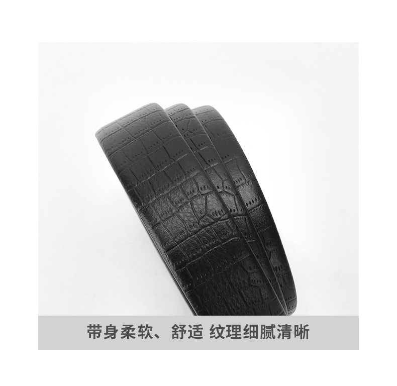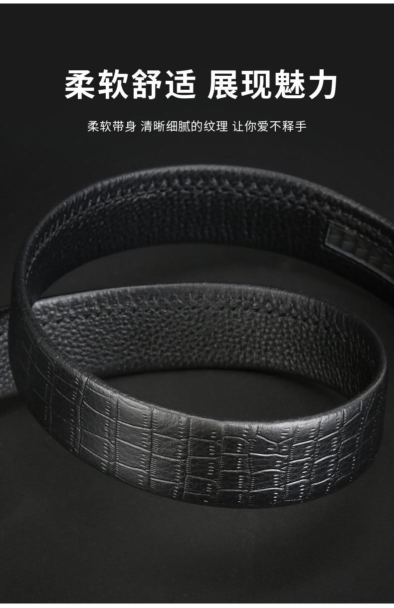 皮带采用头层皮压花,猪肠带做法,手感细腻,质感舒适,扣头采用锌合金电镀工艺,磨砂贴片,扣头中间品牌LOGO点缀,让整个设计更显大方简洁!