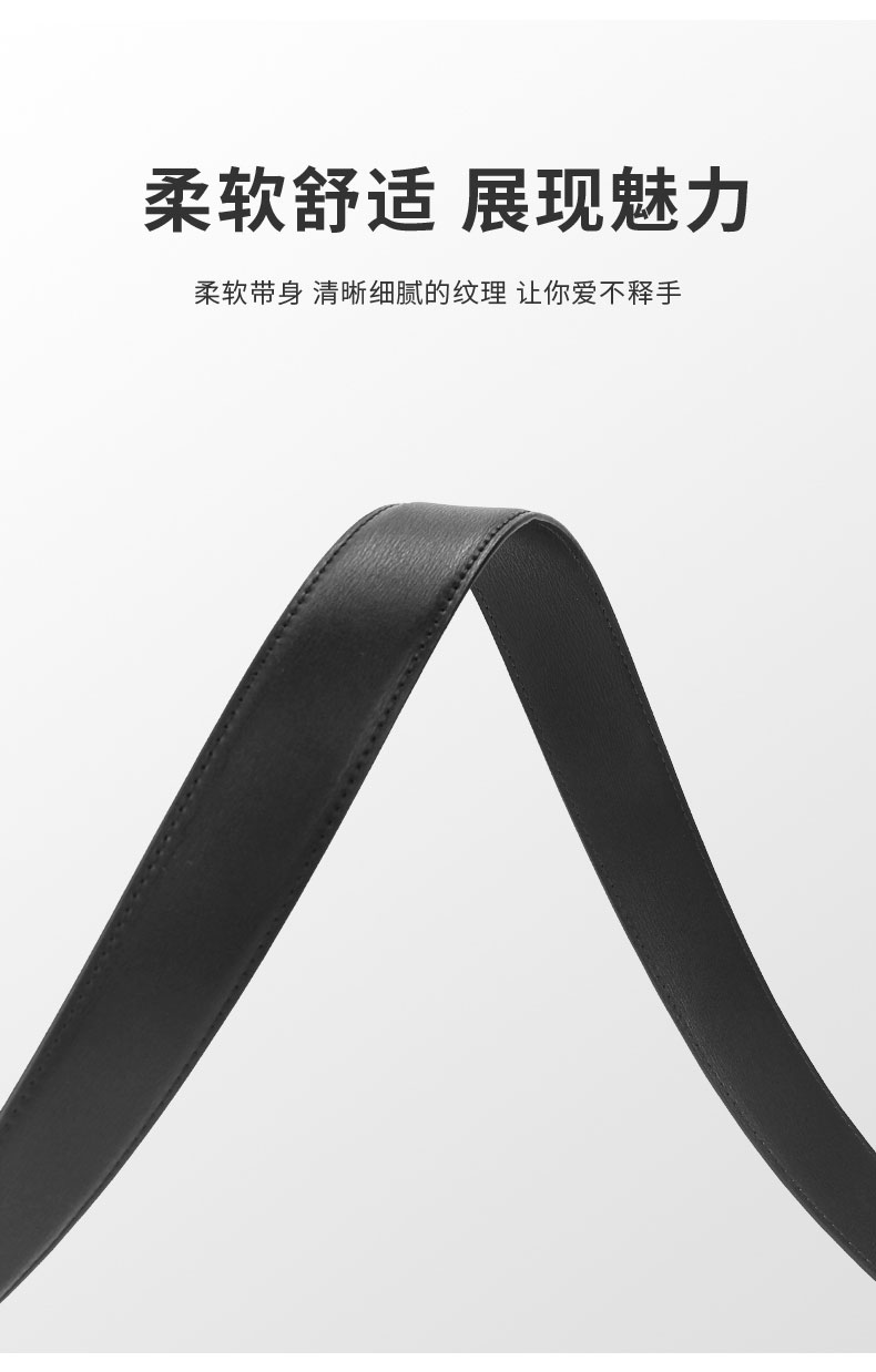 带身面皮采用“耐刮耐磨”擦的柔软平细牙签纹二层皮, 外观细密柔软!搭配锌合金扣头,带身两边油边设计,走线工整,无缝连接、构想更增添立体感!款式简洁,高端大气有档次!