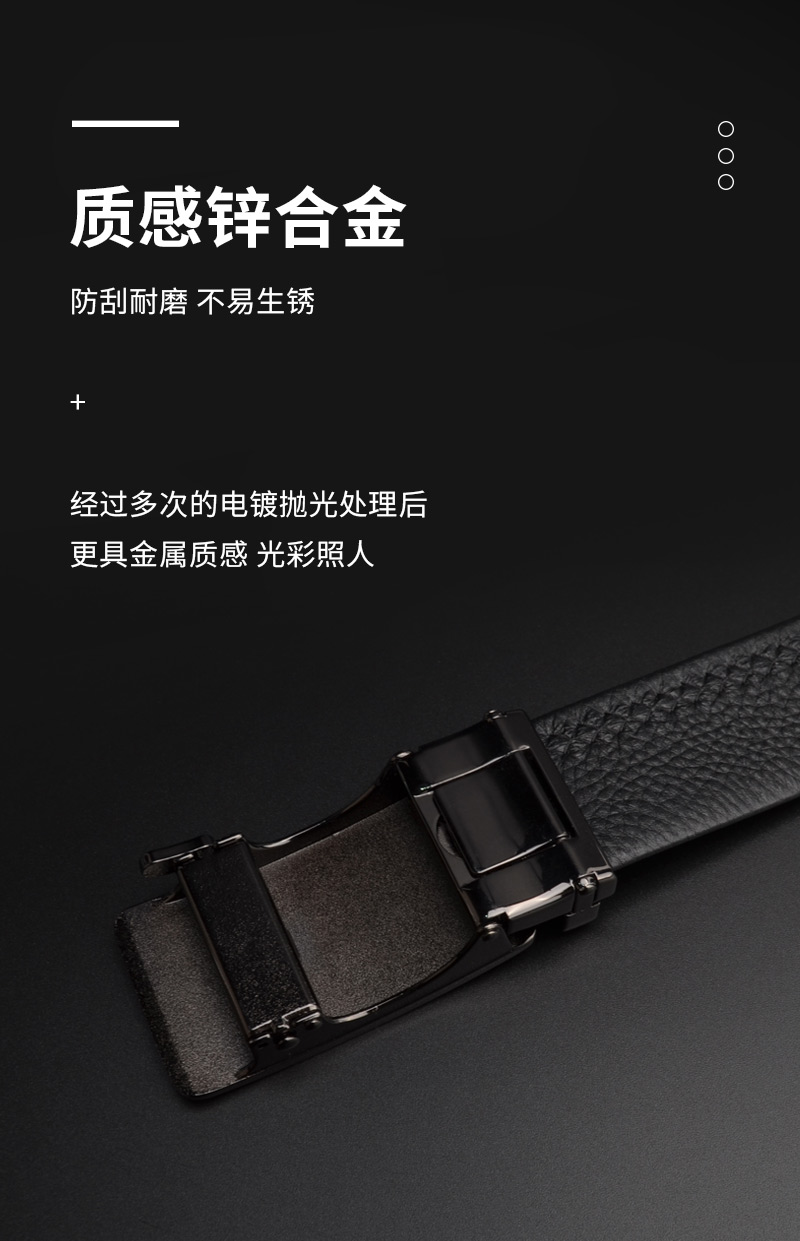 本品采用金属质感好、抗氧化、坚固耐用、不易断裂、经典耐看的高端合金材质扣头,电镀时尚浅金色品牌标志、手感细腻,质感舒适、荔枝纹路清晰的牛皮带身配套搭配,美观协调,尾部还有压印品牌logo,更显高端,精美礼盒包装