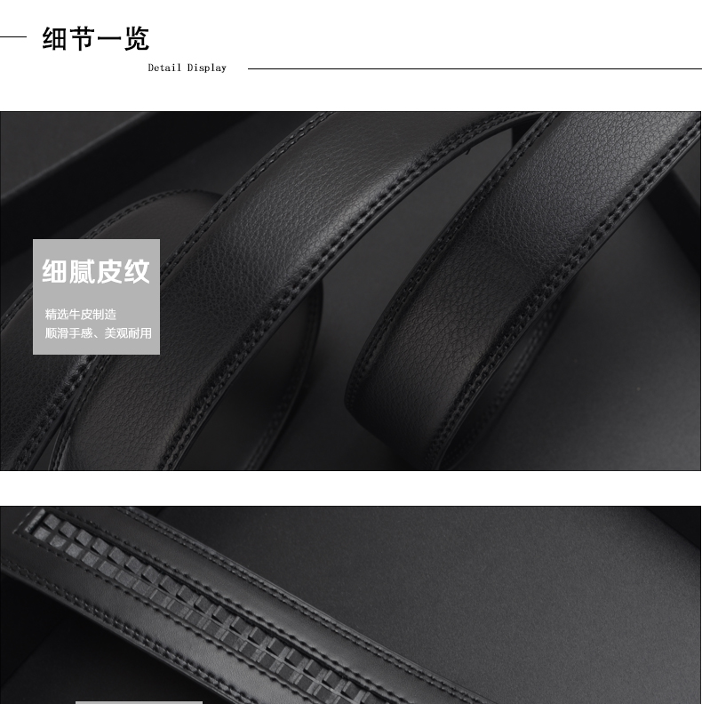 锌合金材质扣头+真空电镀,亚克力贴片工艺尽显质感,内置贴片LOGO设计,带身采用车线+油边工艺美观且耐用,内部采用高强度防变形夹心