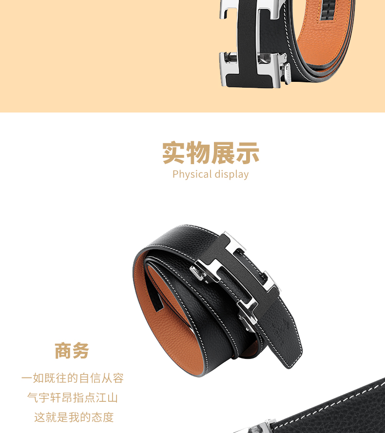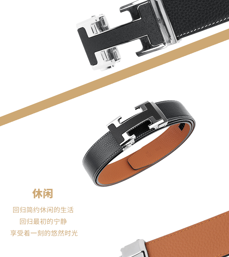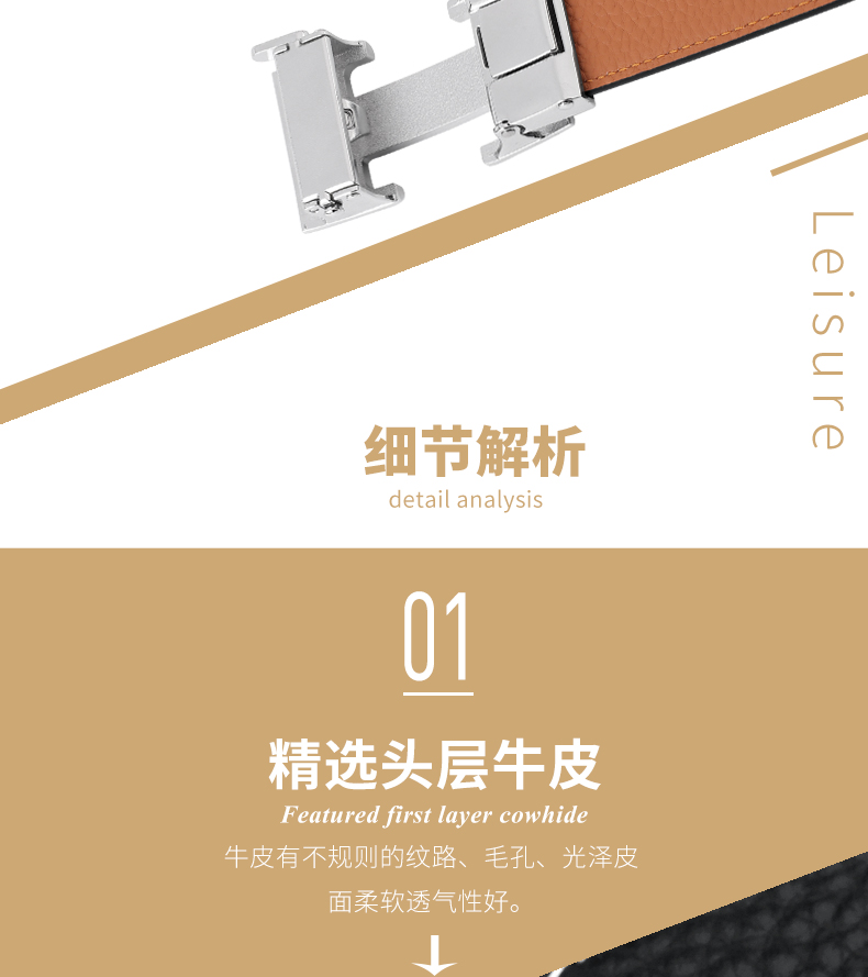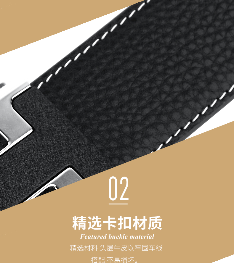 锌合金五金扣头,真空电镀工艺靓丽如镜面,激光雕刻纹理+贴标品牌LOGO,带身采用头层牛皮,耐变形夹层保证皮带在使用中不易变形,封边采用车线+油边工艺,带身尾部采用热压印LOGO工艺