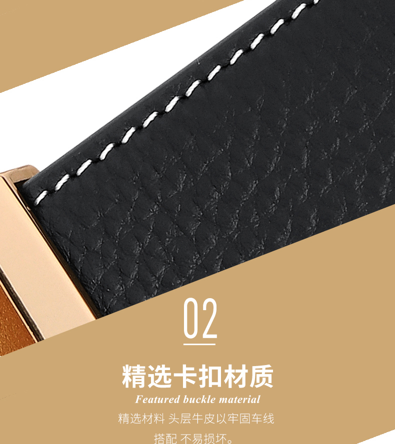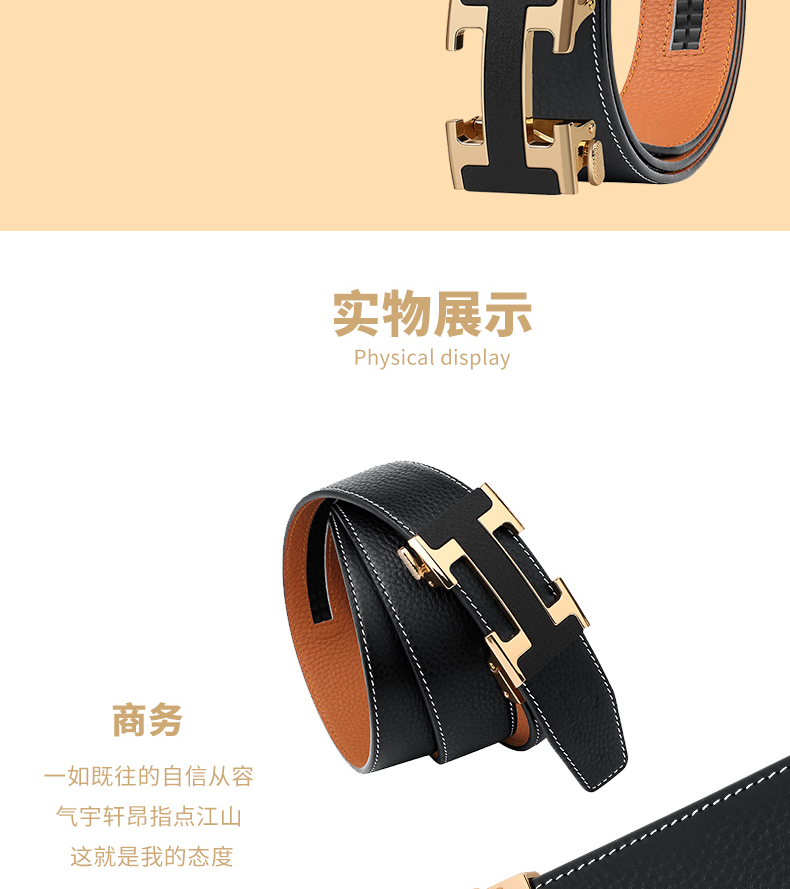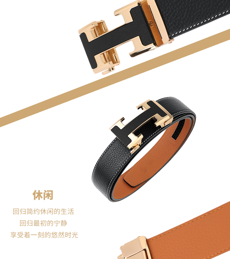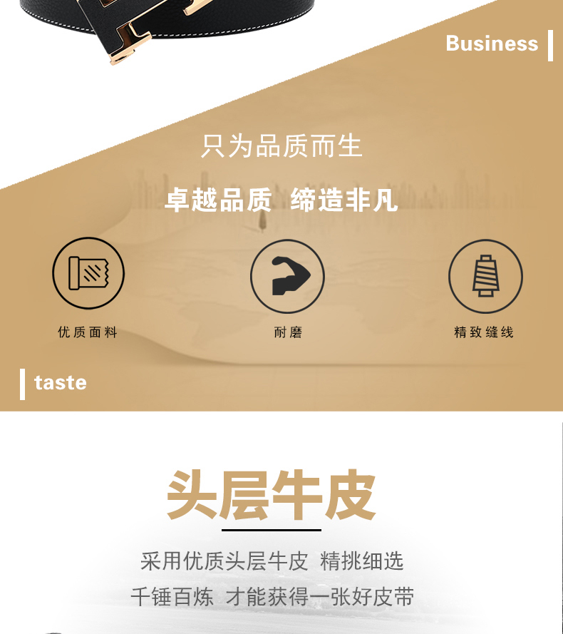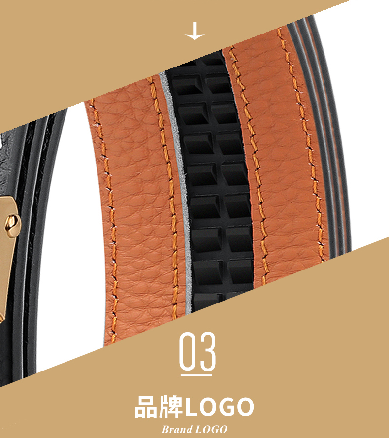 锌合金五金扣头,真空电镀工艺靓丽如镜面,激光雕刻纹理+贴标品牌LOGO,带身采用头层牛皮,耐变形夹层保证皮带在使用中不易变形,封边采用车线+油边工艺,带身尾部采用热压印LOGO工艺