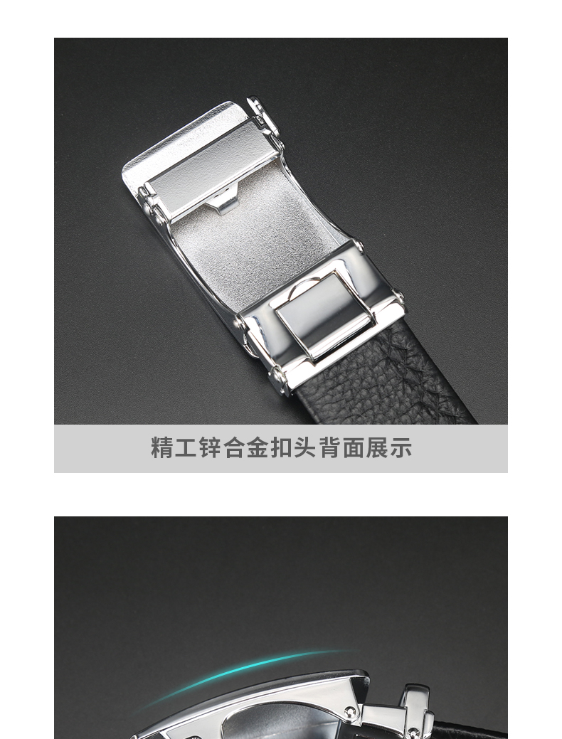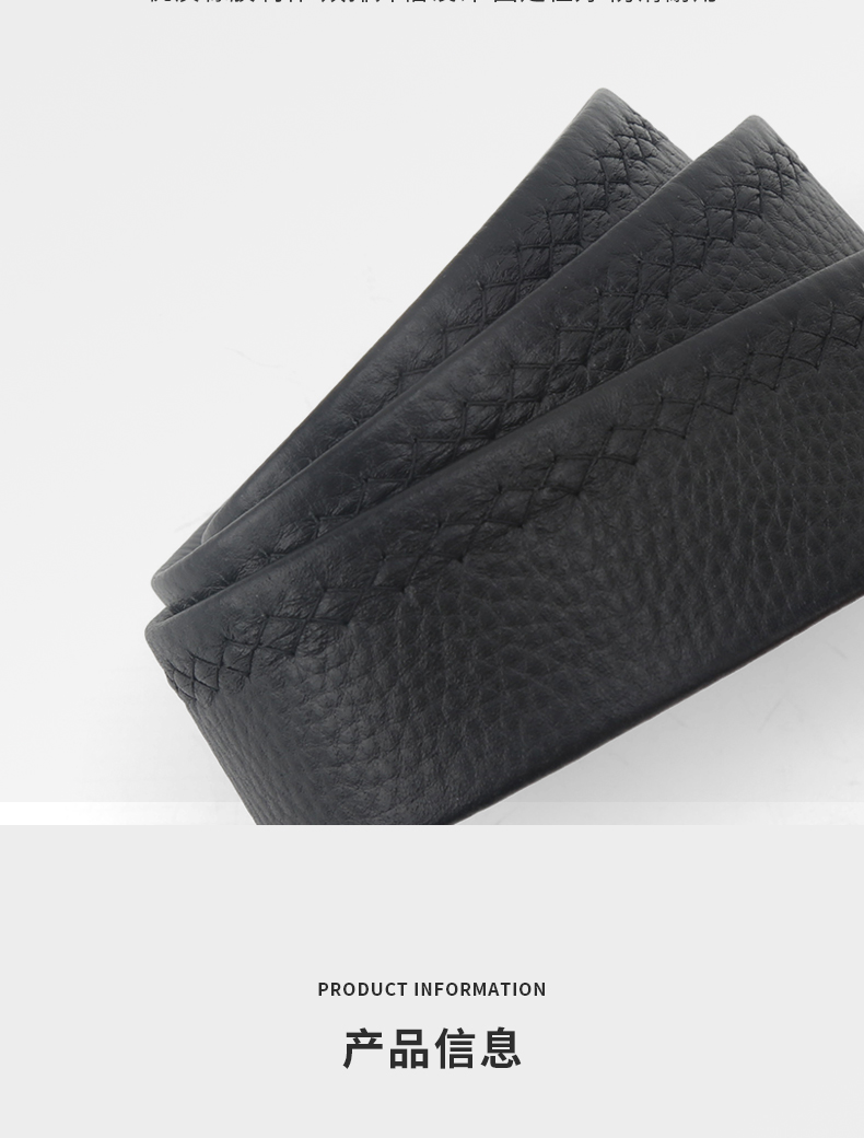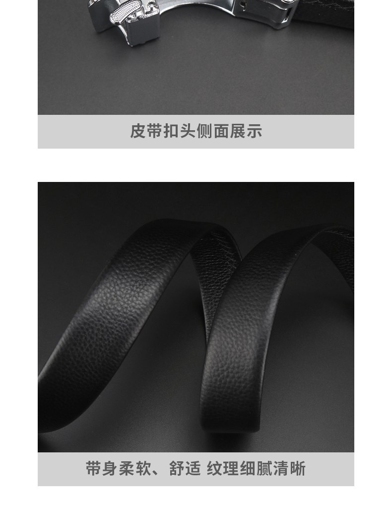 本品采用金属质感好、抗氧化、坚固耐用、不易断裂、经典耐看的络色高端合金材质扣头,电镀时尚浅金色品牌标志、手感细腻,质感舒适、荔枝纹路清晰的牛皮带身配套搭配,美观协调,尾部还有压印品牌logo,更显高端,精美礼盒包装。