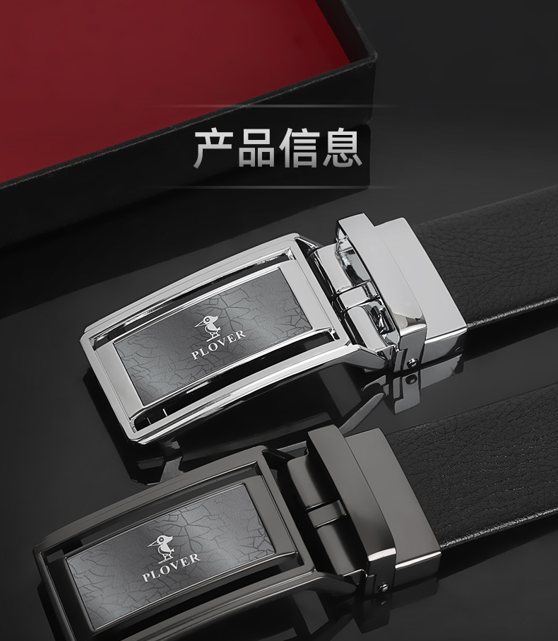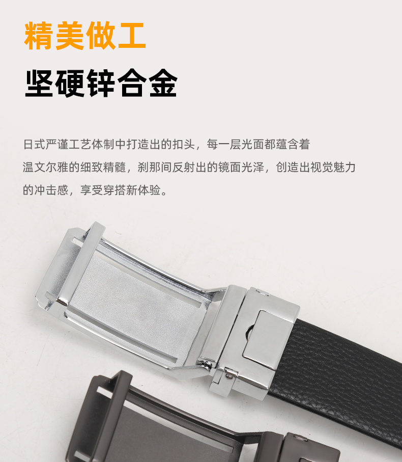 选用优质头层牛皮, 皮质细腻手感舒适,经久耐用,带身商务时尚做法,无缝、无线做法,搭配新款动感合金扣头,一按轻松解开皮带,无需开关,时尚大气,提升档次和形象。