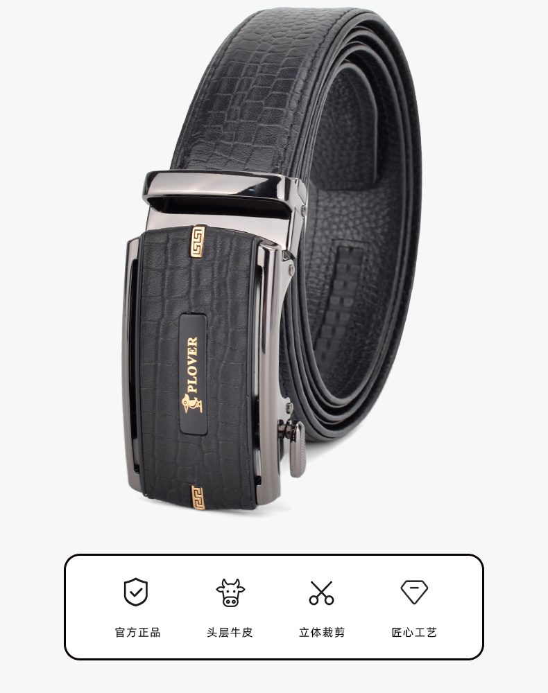 本产品设计新颖,带身面材质采用彰显气质的蜥蜴纹头层皮,底材质采用纹路清晰分明的荔枝纹头层皮。.高端合金扣头面贴蜥蜴纹头层皮,与带身蜥蜴纹皮配套搭配,美观协调.扣头面金色激光品牌LOGO,更显高端,此带身手感舒适,大气美观,尾部还有压印品牌LOGO.高档包边车线做法,永无后顾之忧