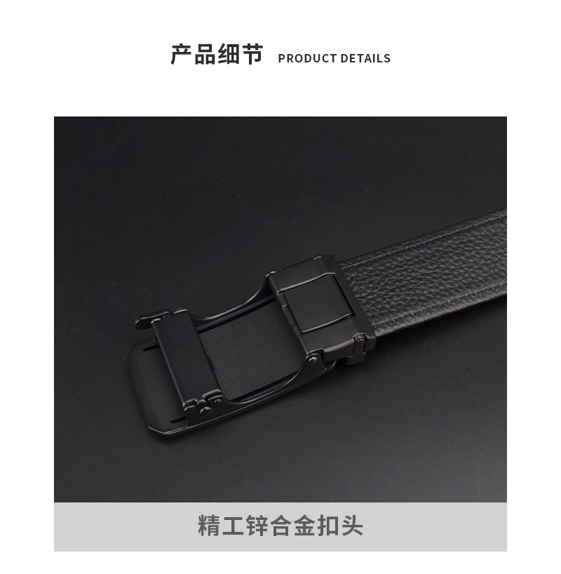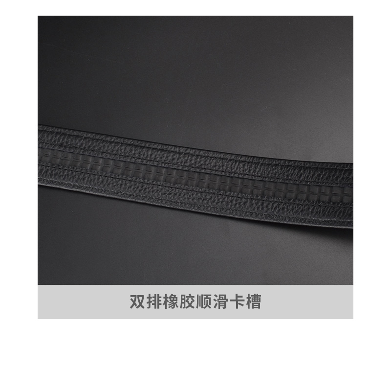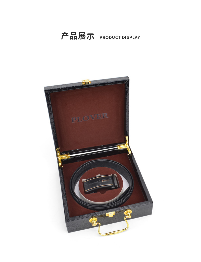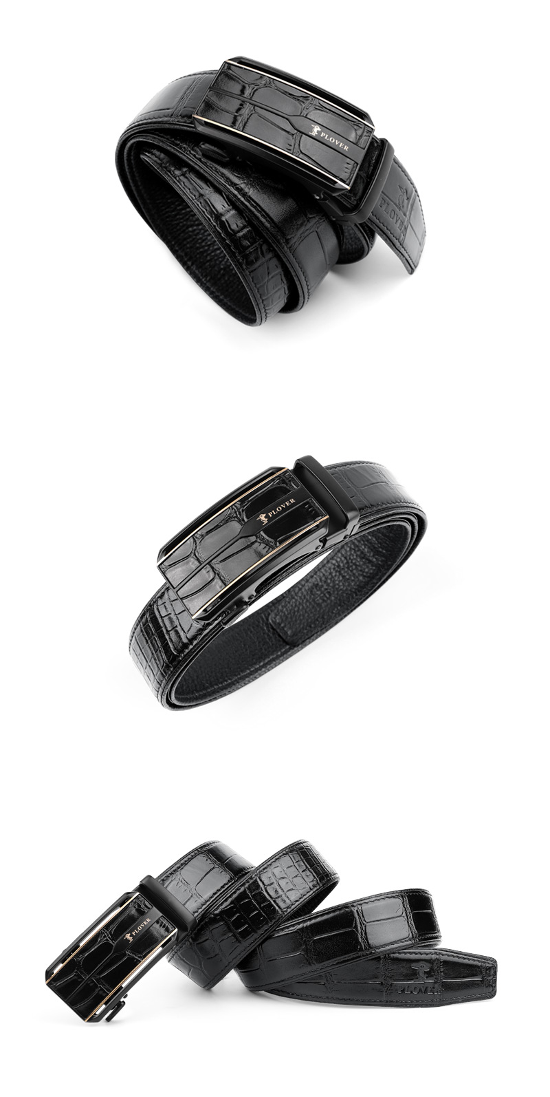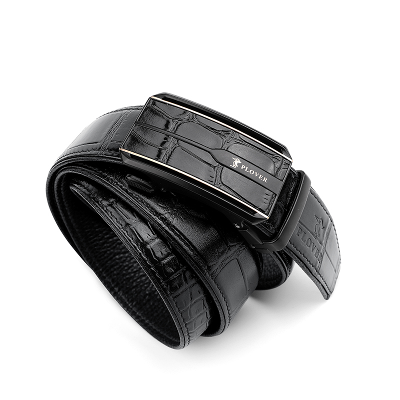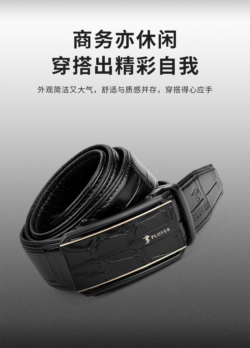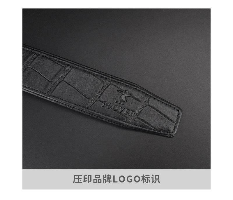 本产品设计新颖,带身面材质采用彰显气质的鳄鱼纹头层皮,底材质采用纹路清晰分明的荔枝纹头层皮.高端合金扣头面贴鳄鱼纹头层皮,与带身鳄鱼纹皮配套搭配,美观协调.扣头面金色激光品牌LOGO,更显高端,此带身手感舒适,大气美观,尾部还有压印品牌LOGO.高档包边车线做法,永无后顾之忧