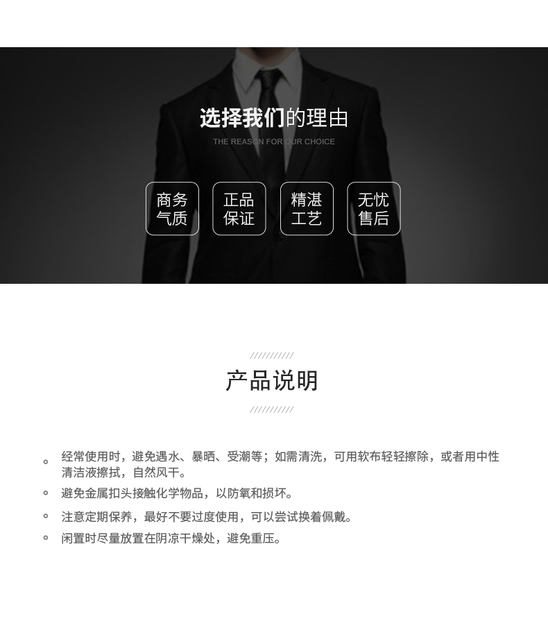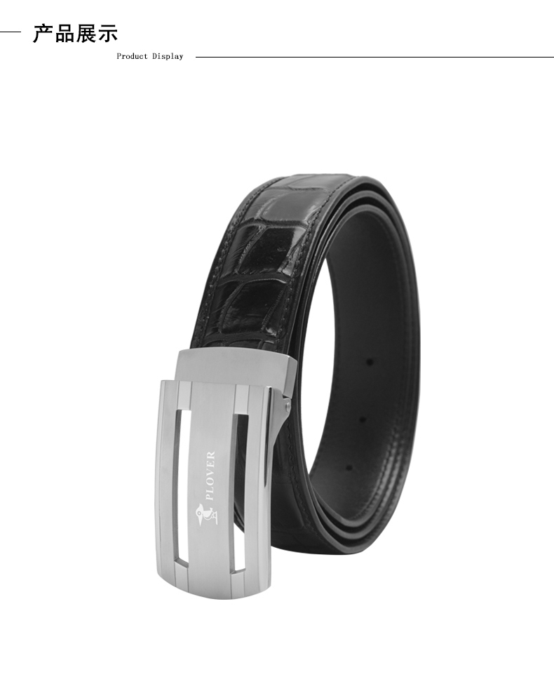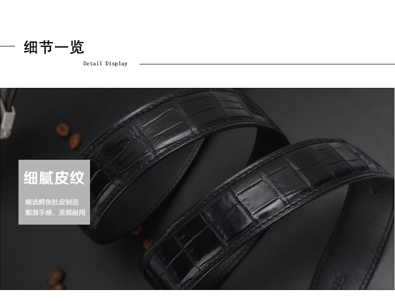 本产品带身面皮采用真鳄鱼肚皮,此皮面磅礴大气,纹理自然饱满,抗拉伸不易变形,底是皮质柔软,耐磨性强的头层平纹皮,此带身手感细腻,质感舒适,且告别老式扣头,搭配新式不锈钢扣,金属感十足,此扣头不但耐高温、抗氧化、且坚固耐用。传统和现货相结合的做工、鳄鱼纹高端皮盒,使本产品突显高大上。