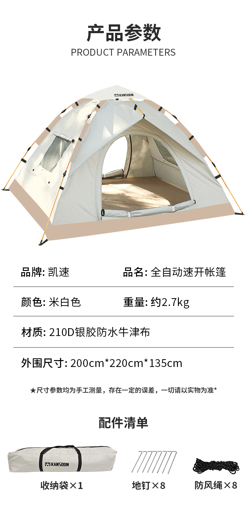 凯速户外全自动帐篷200cm*220cm*135cm米白色 ZP02