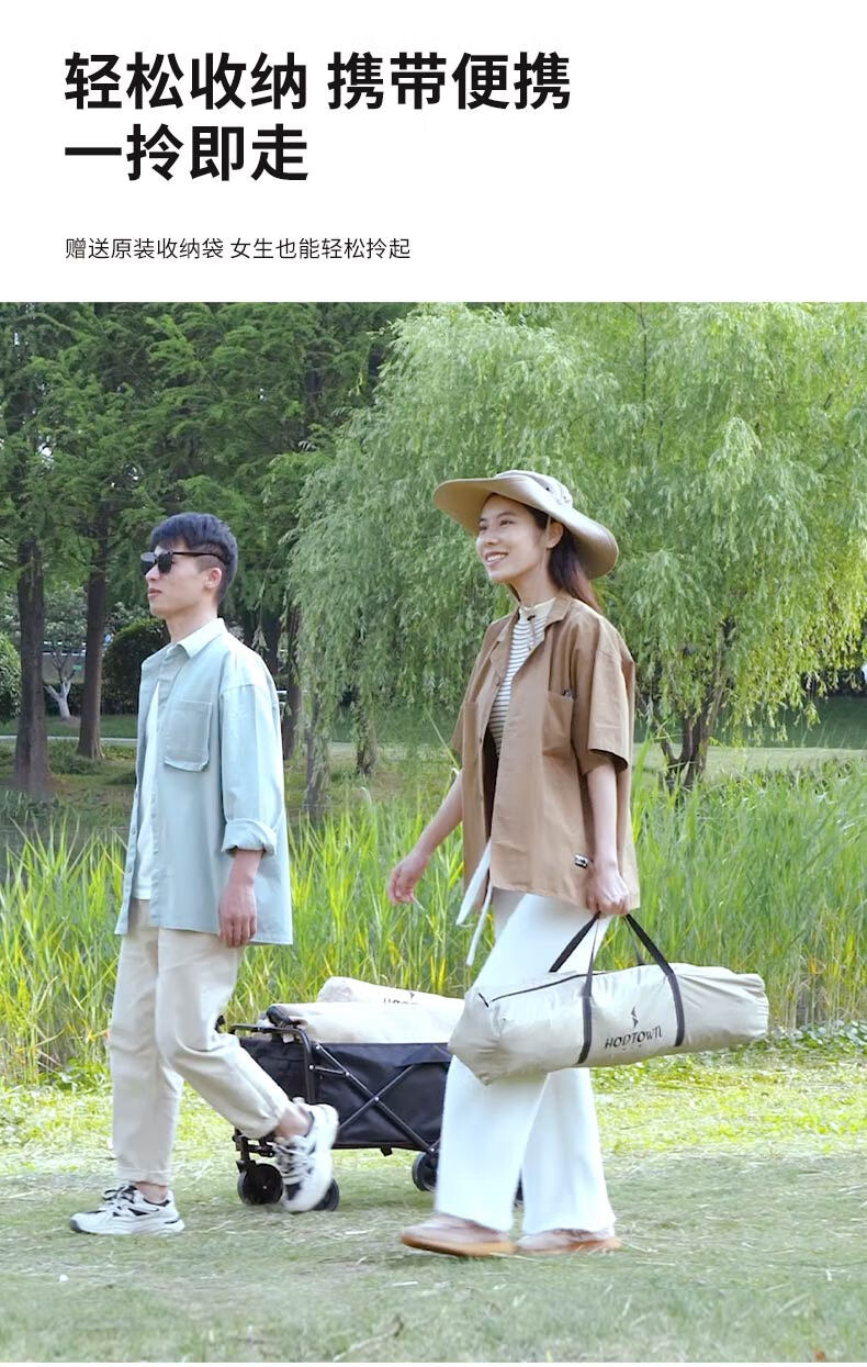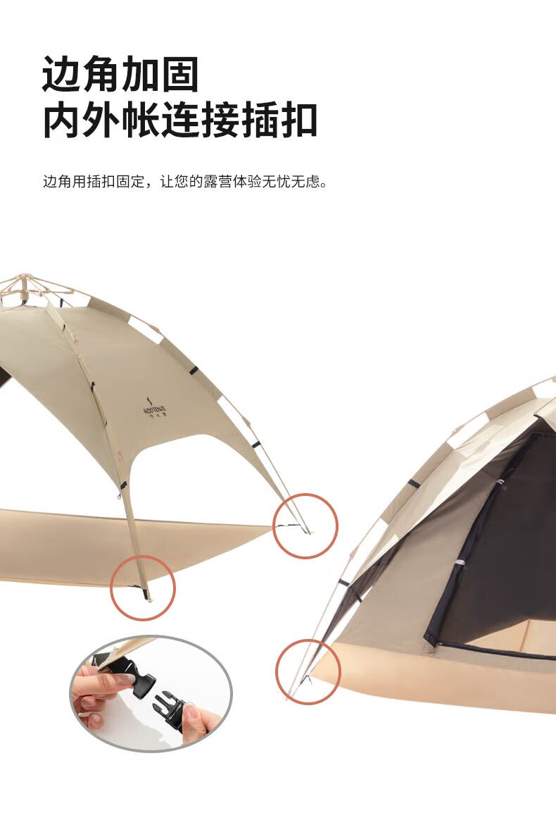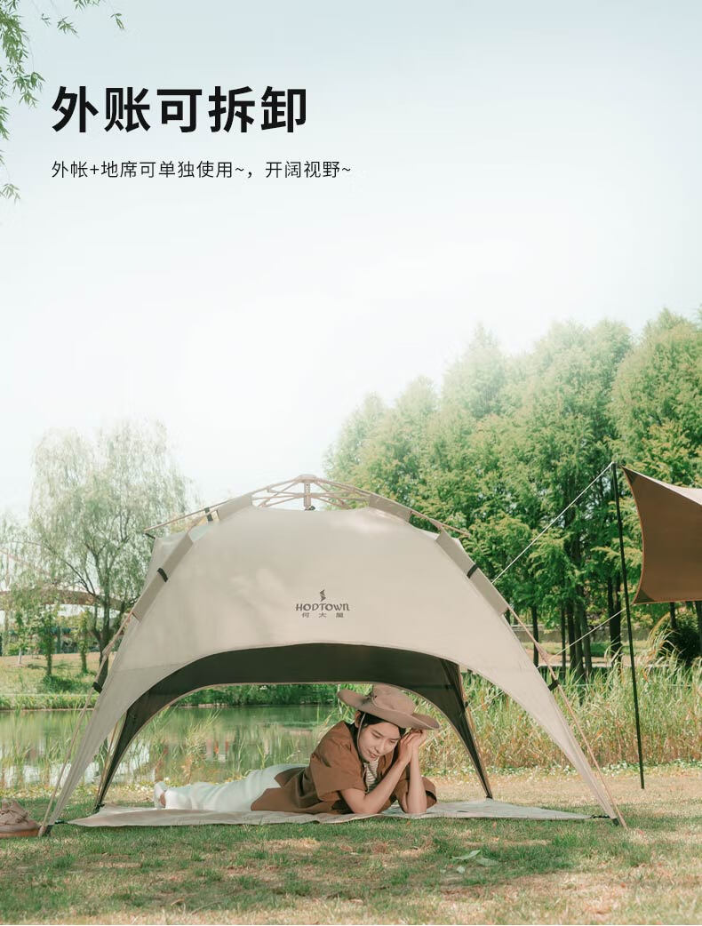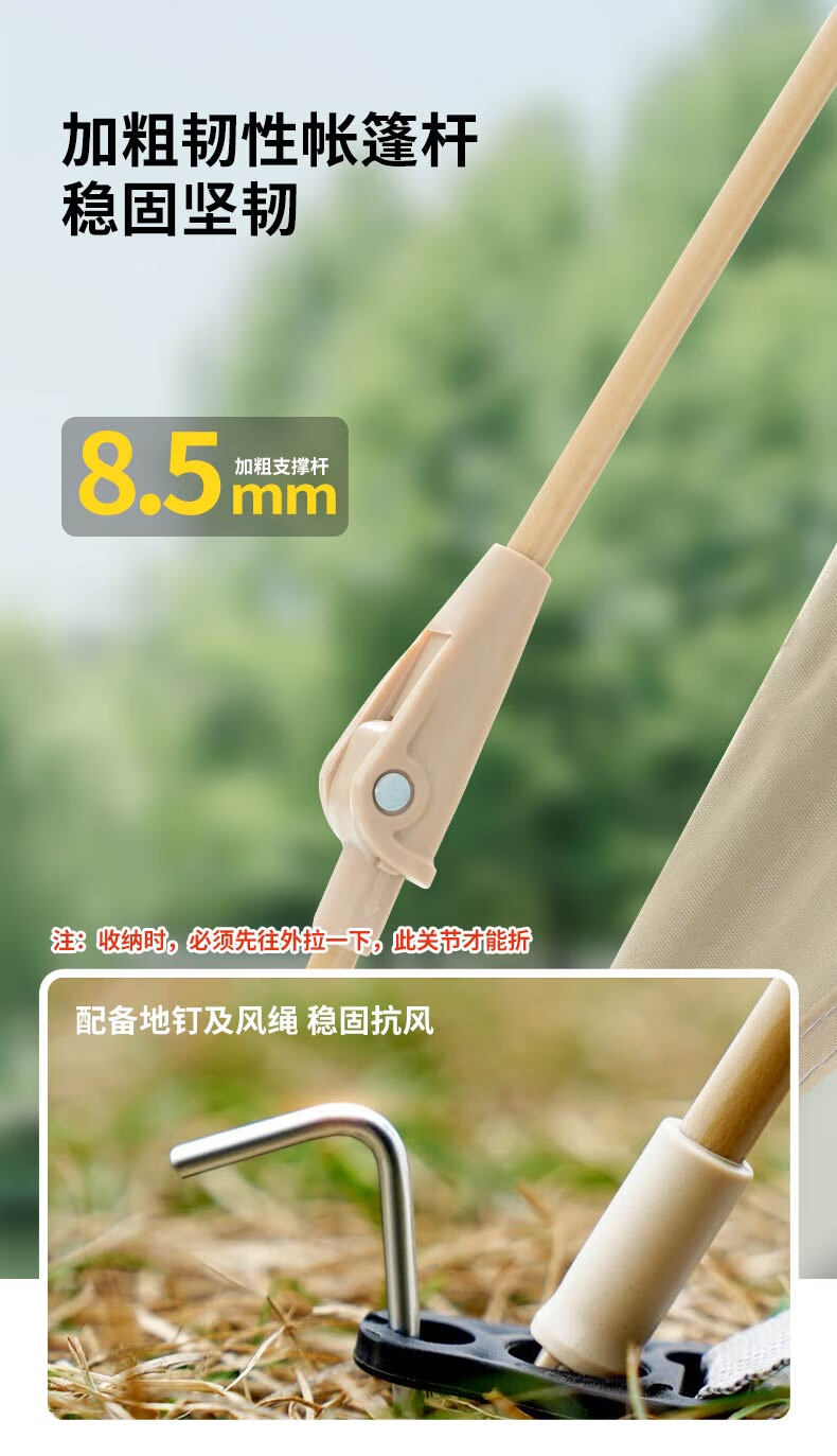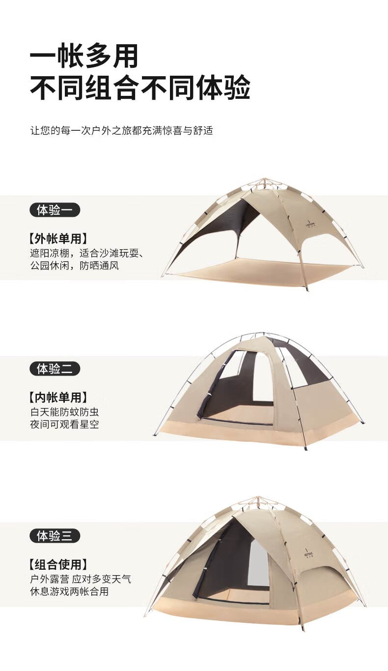 外帐面料采用210D黑胶pu布,有出色的防晒能力,防泼水、遮光、遮温、可自动速开搭建,方便使用。