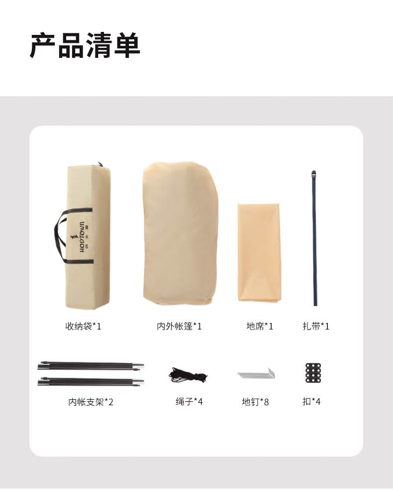 配件:帐篷、内帐支架*2、地席*1 地钉*8、防风绳*4、扣*4、收纳袋