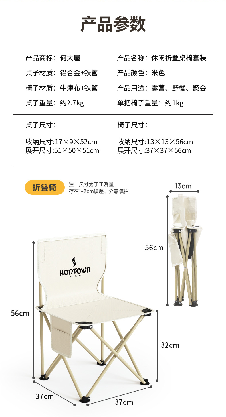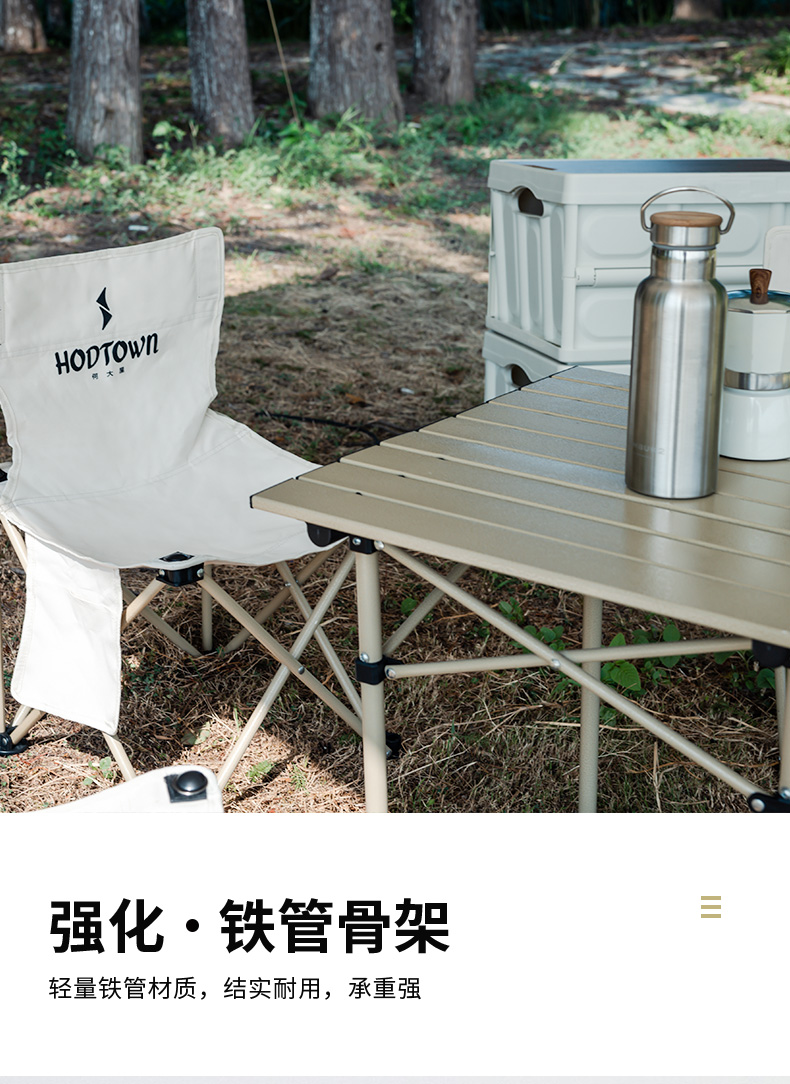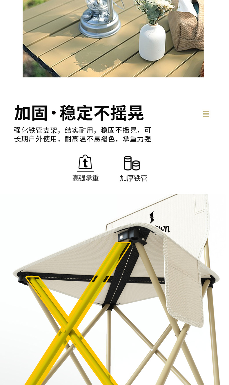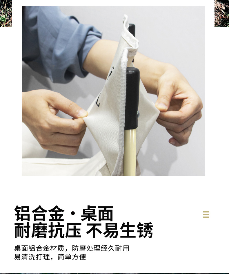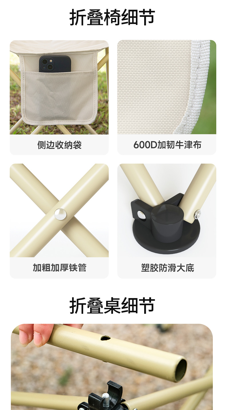 材质:铝合金桌面、铁管支架、双层600D牛津布椅面