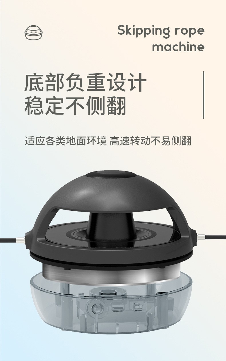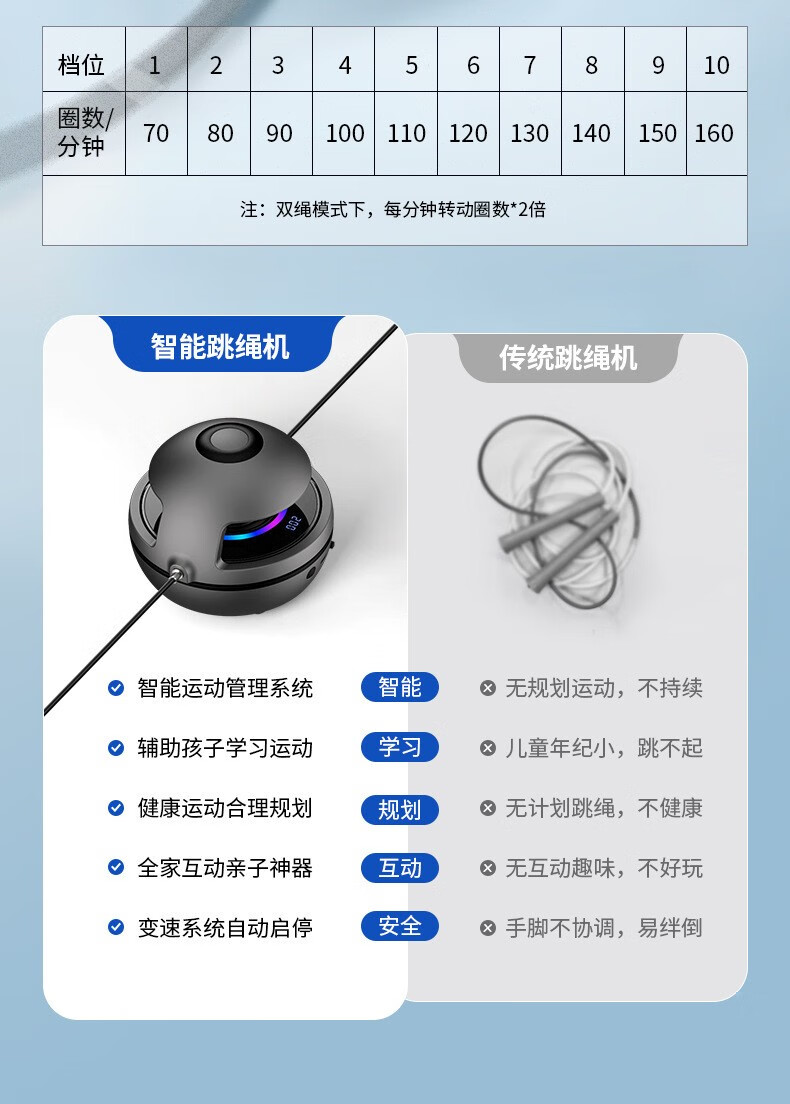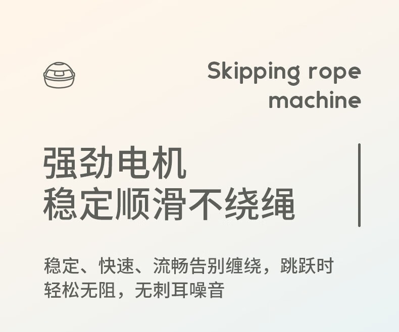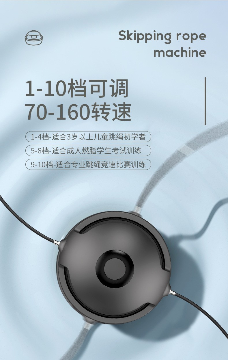 ②机器看似很小,却很有分量感,内置锂电池,无线遥控,运动数据液晶显示系统,1-10档速度调节变速装置(1档转速分钟跳60次,10档转速1分钟跳150次),1-3档适合初学跳绳者,比如儿童,老人,初学跳绳的宝妈,小夫妻;3-6档适合中级跳绳者,比如中小学生,跳绳减肥人士;6-10档适合专业级别跳绳的运动员。