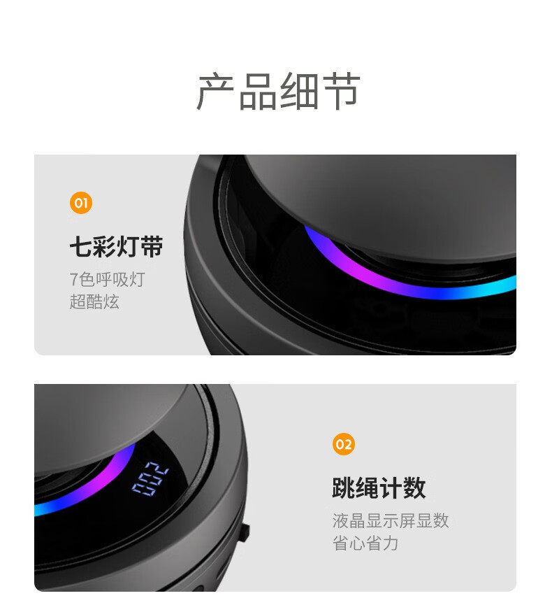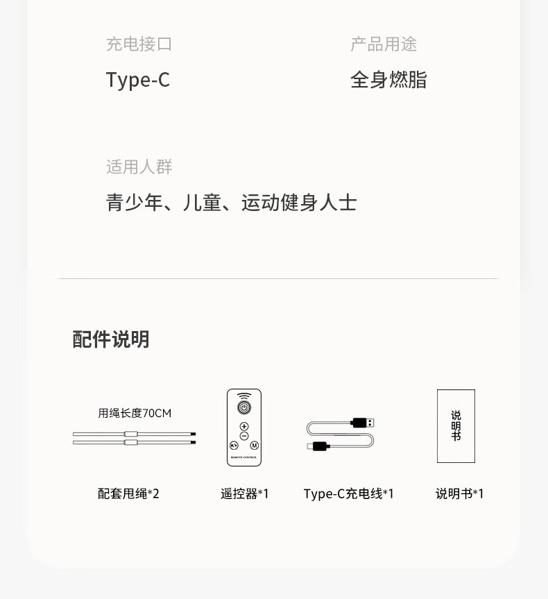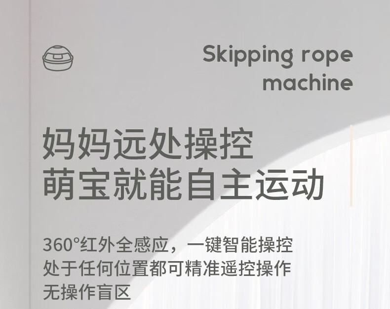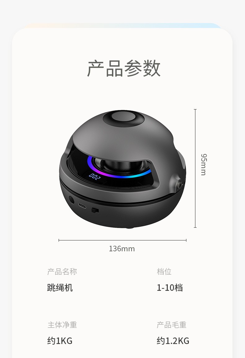 ②机器看似很小,却很有分量感,内置锂电池,无线遥控,运动数据液晶显示系统,1-10档速度调节变速装置(1档转速分钟跳60次,10档转速1分钟跳150次),1-3档适合初学跳绳者,比如儿童,老人,初学跳绳的宝妈,小夫妻;3-6档适合中级跳绳者,比如中小学生,跳绳减肥人士;6-10档适合专业级别跳绳的运动员。