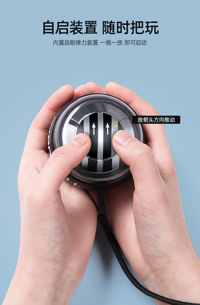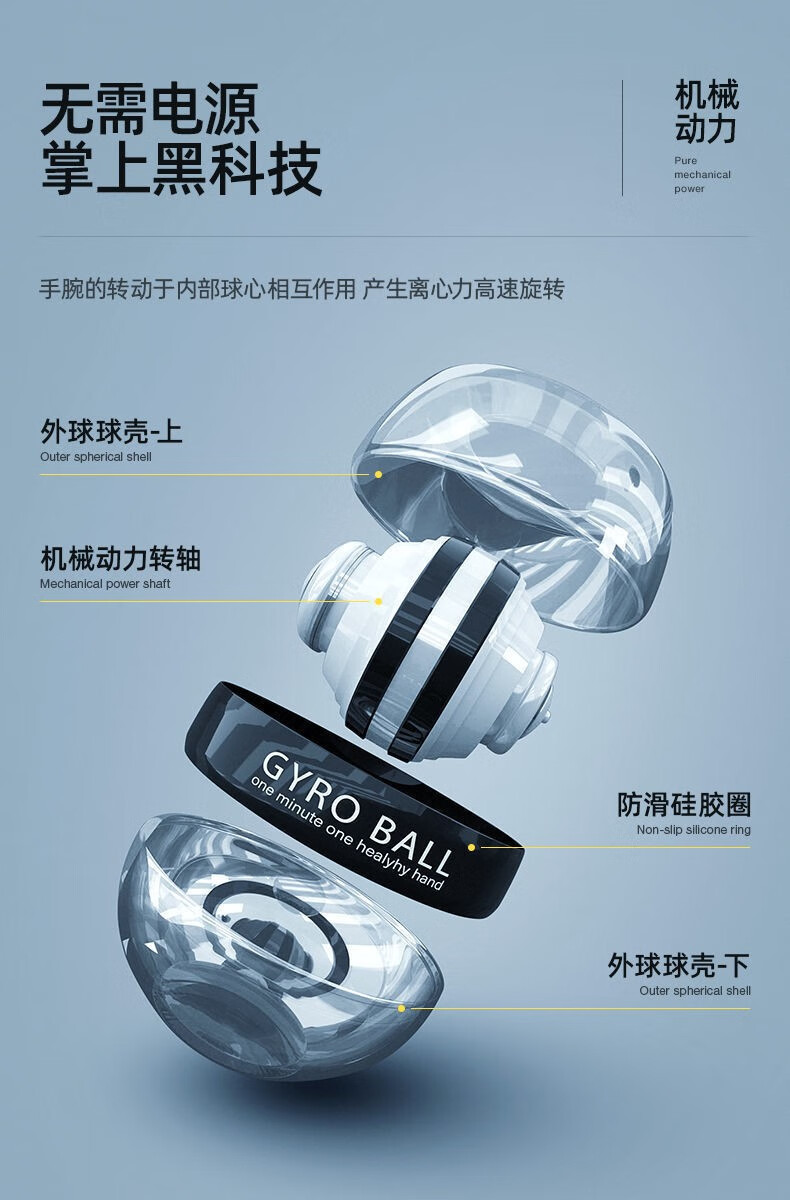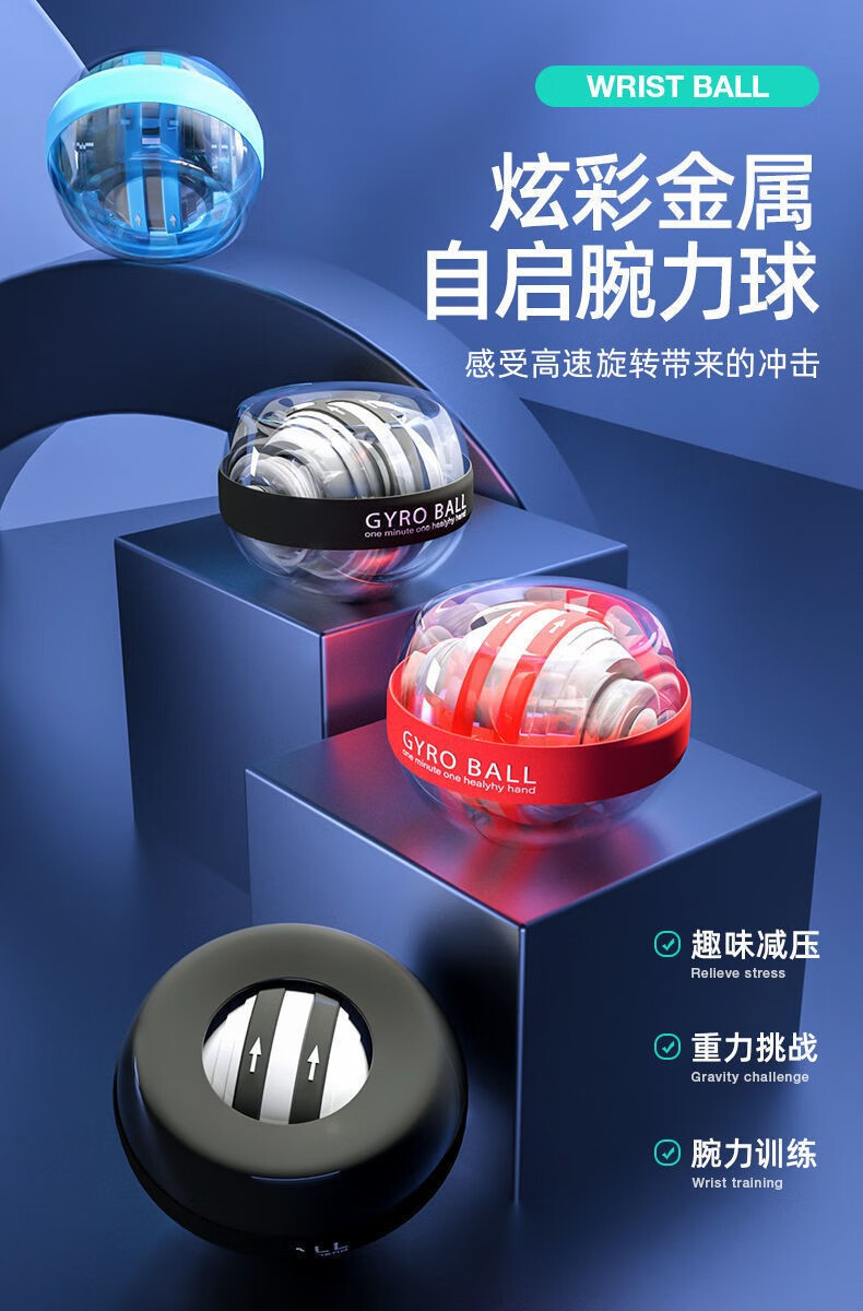 腕力球是一种人工动力装置,纯机械,不用电池和任何电源,没有电磁辐射,靠手腕的转动带动球芯高速旋转,进而产生强大的力量。通过人为控制,可以任意调节球芯旋转的节奏和速度,速度越快则产生的力量越大,对锻炼手指、手腕、手臂的力量和韧性非常具有帮助,并且集运动、娱乐、健身于一体。