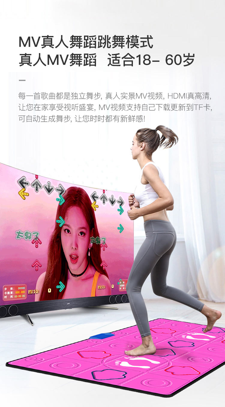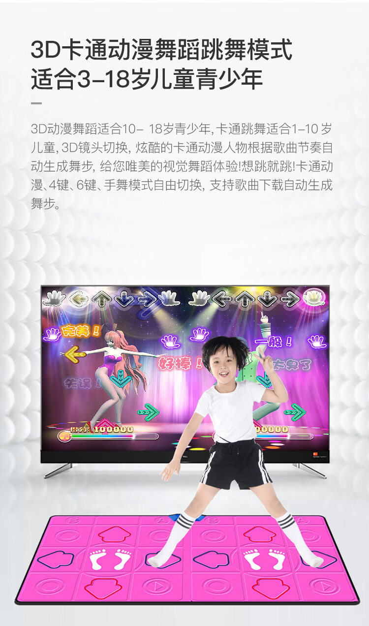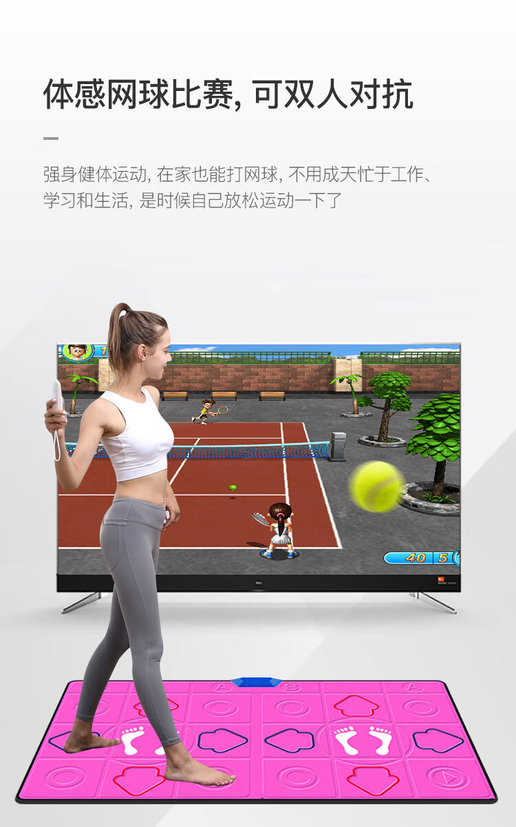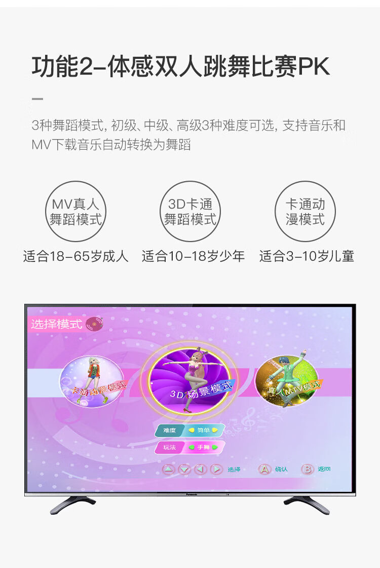 4.3种跳舞模式:①体感MV-KTV真人舞蹈适合18-60岁中年人②儿童卡通体感舞蹈适合儿童 ③3D动漫舞蹈适合12-18岁青少年。支持4键,6键,初、中、高级难度。体感控制,踩踏毯面,配合无线手柄支持手舞足蹈。5.广场舞功能,适合老人,老头老太。6.互动体感运动游戏(体感网球,体感乒乓球,体感切水果,体感划船,体感篮球等)