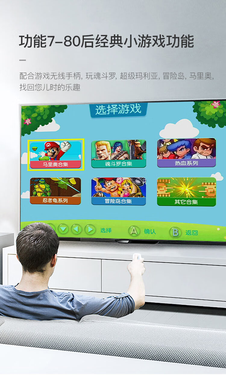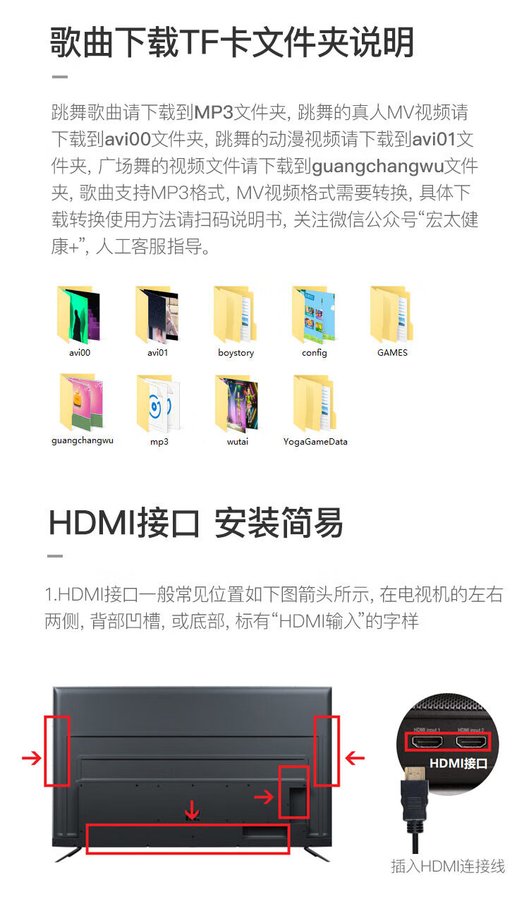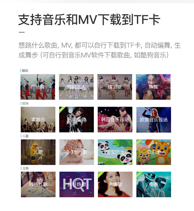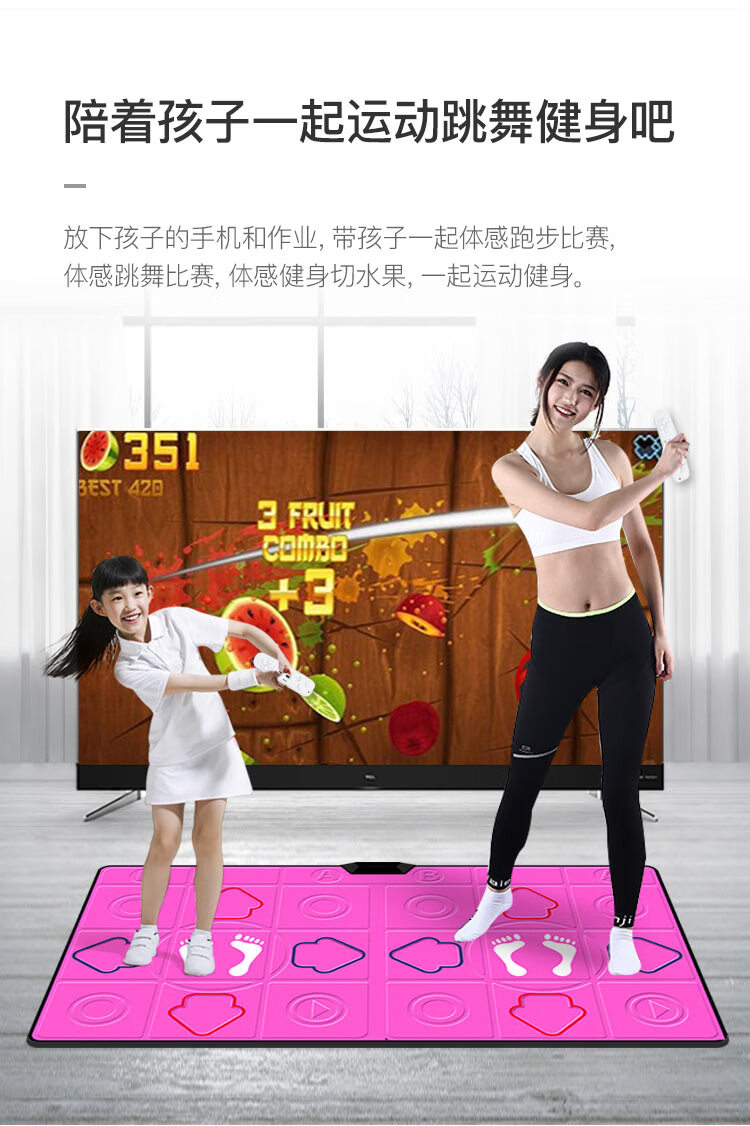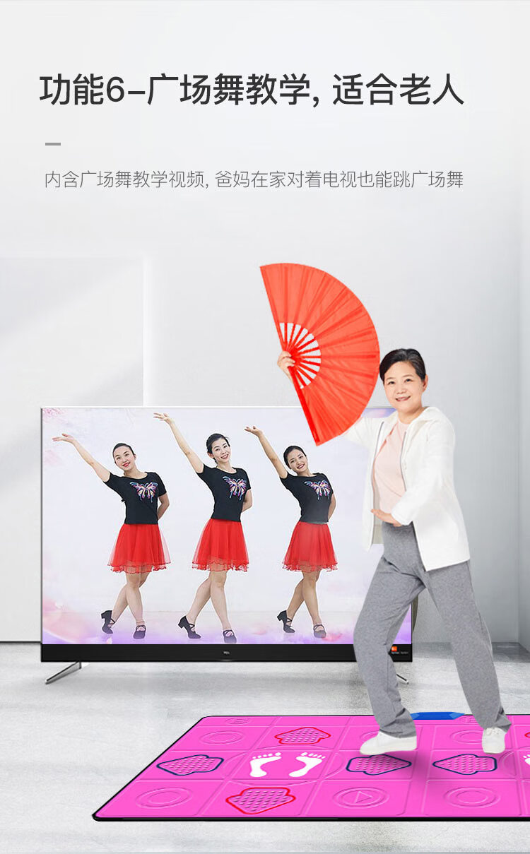 4.3种跳舞模式:①体感MV-KTV真人舞蹈适合18-60岁中年人②儿童卡通体感舞蹈适合儿童 ③3D动漫舞蹈适合12-18岁青少年。支持4键,6键,初、中、高级难度。体感控制,踩踏毯面,配合无线手柄支持手舞足蹈。5.广场舞功能,适合老人,老头老太。6.互动体感运动游戏(体感网球,体感乒乓球,体感切水果,体感划船,体感篮球等)