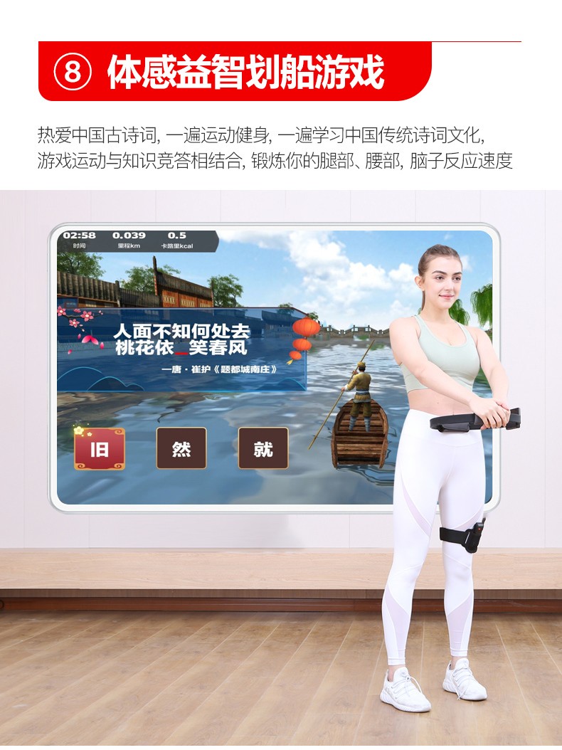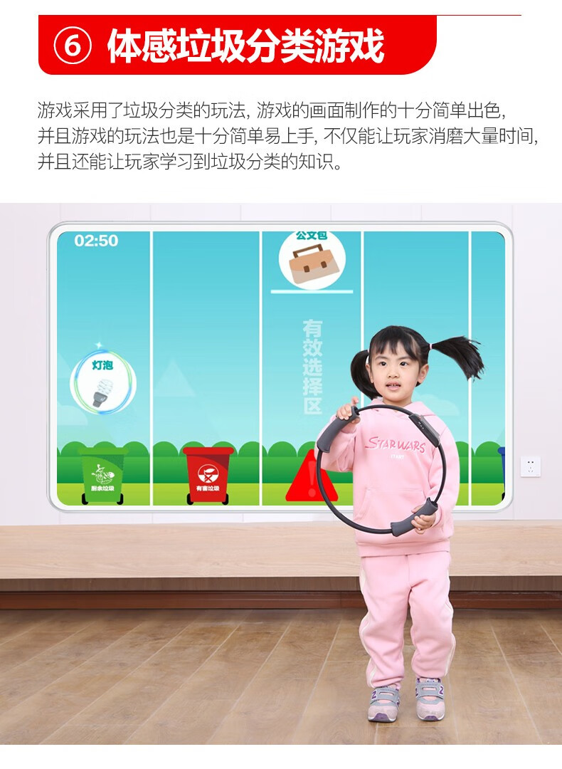 满足3-70岁不同人群使用,内置体感瑜伽,体感健身操,游戏会定期免费更新,每次更新3-5款,目前内置16款体感益智游戏①体感障碍酷跑游戏②体感跳一跳游戏③体感赛车运动游戏④体感音乐环环游戏⑤体感棒球击打游戏⑥体感垃圾分类游戏⑦体感节奏空间游戏⑧体感益智划船游戏⑨体感胸大肌挑战⑩体感穿越侏罗纪⑪体感砸陶罐练臂力⑫体感打气球游戏⑬体感坦克大战游戏⑭体感坦克大战游戏⑮体感天际漫游游戏⑯体感飞车骑行游戏