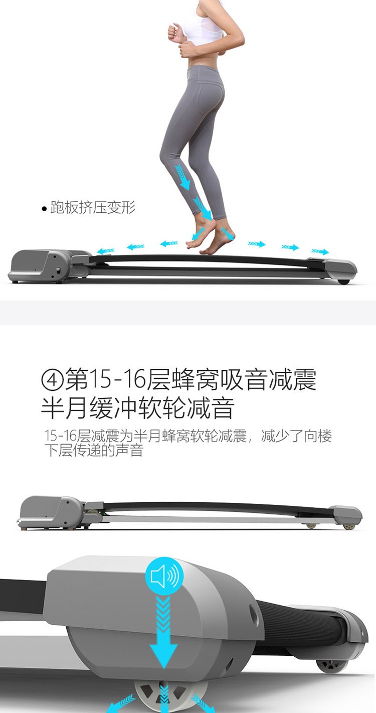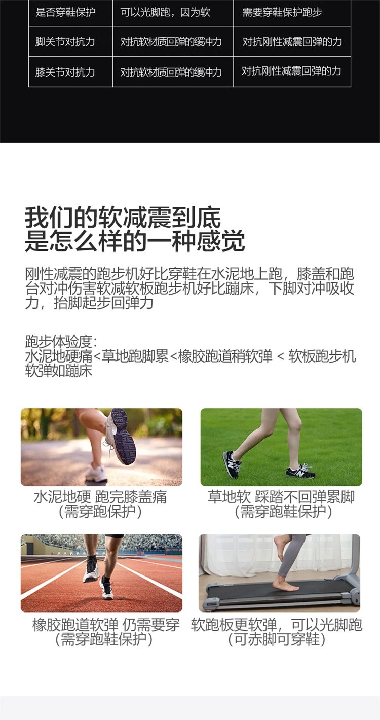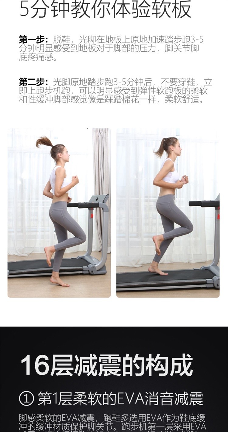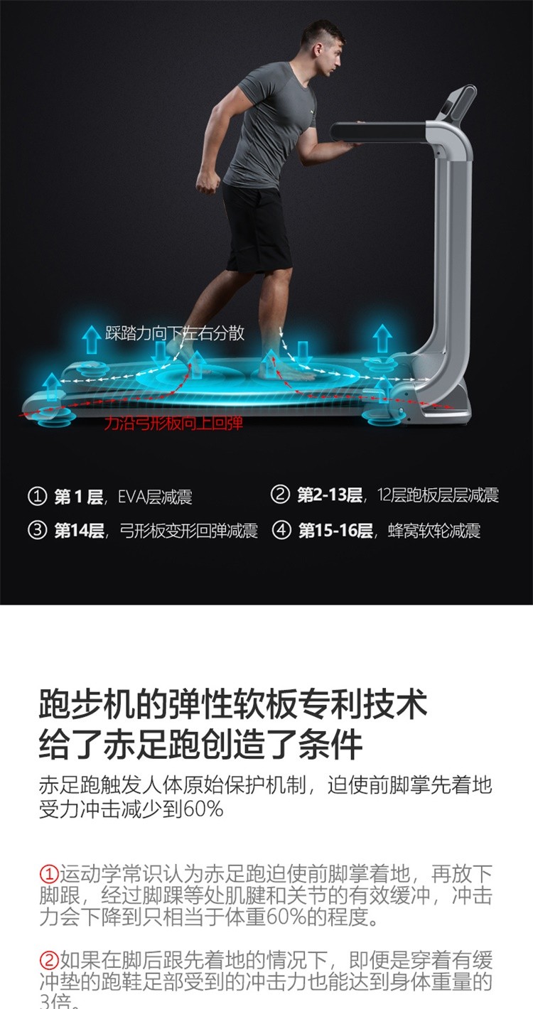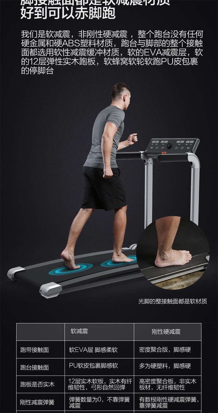 柔性软板跑步机,16级减震消音,16层层分解。不同于硬跑板。我们弓形柔性软跑板技术经过北京体育大学研究,对比测试的是德国价值18万元的HP系列专业跑步机.可以光脚跑,跑带高于跑台设计。自动校正跑带,折叠90°竖立,液压杆调节降落。