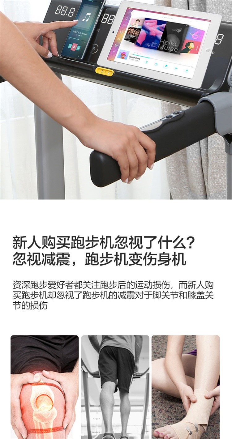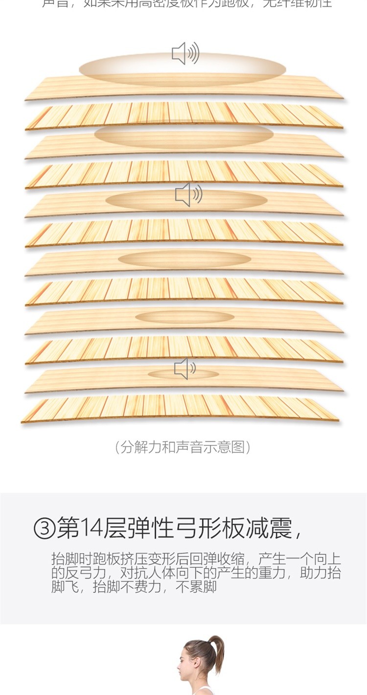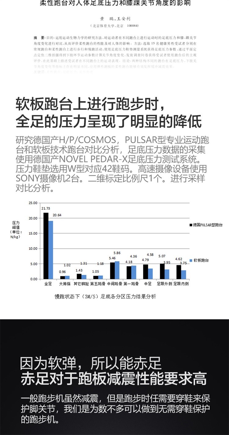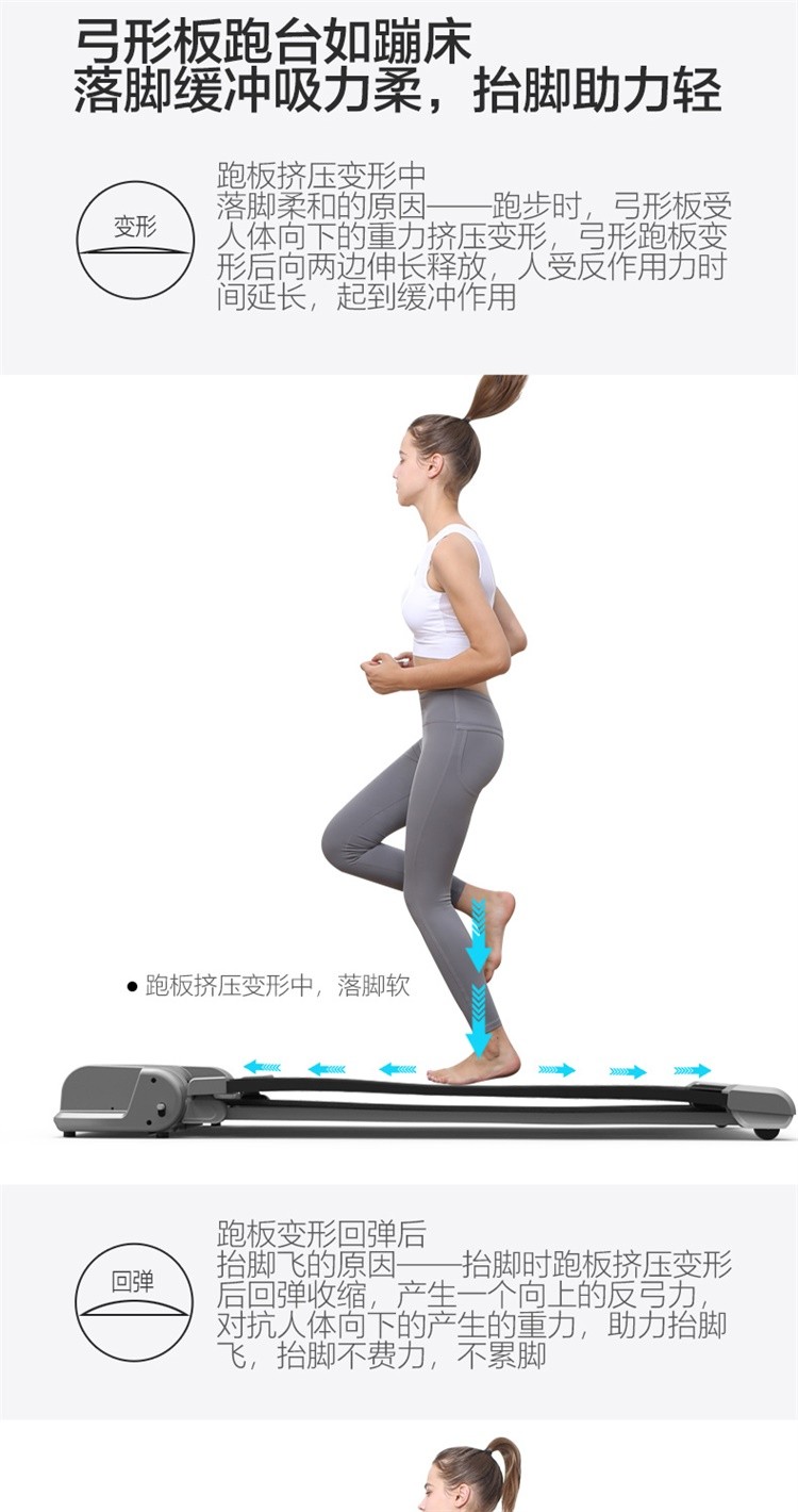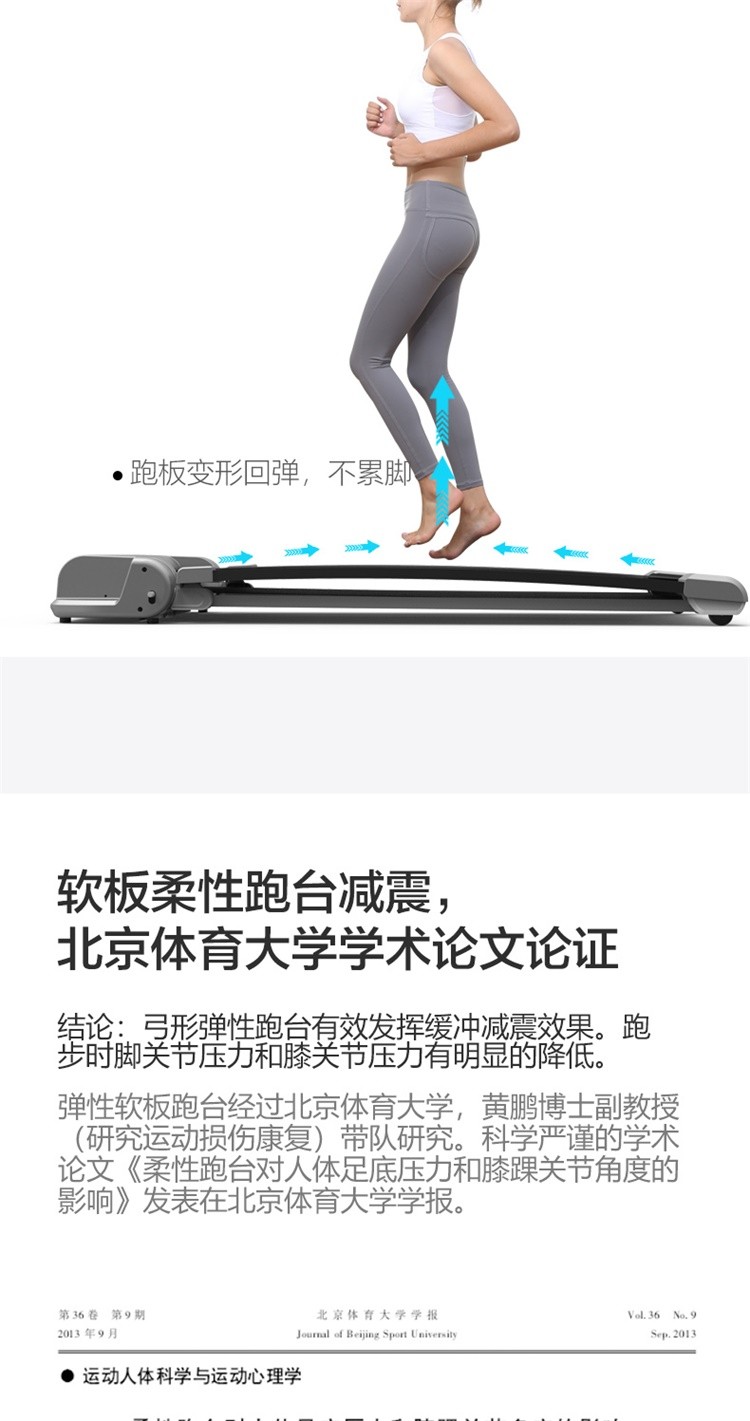 柔性软板跑步机,16级减震消音,16层层分解。不同于硬跑板。我们弓形柔性软跑板技术经过北京体育大学研究,对比测试的是德国价值18万元的HP系列专业跑步机.可以光脚跑,跑带高于跑台设计。自动校正跑带,折叠90°竖立,液压杆调节降落。