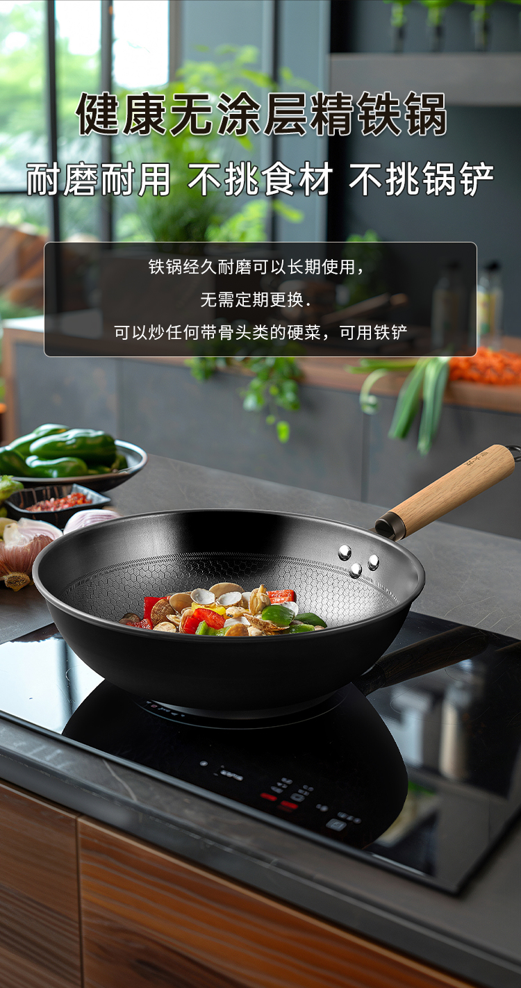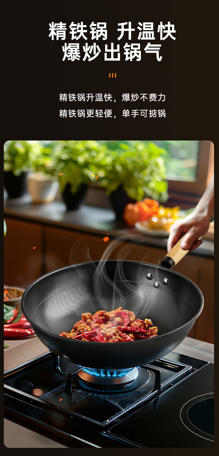 1、精铁锅\不挑灶\升温快黑金蜂巢炒锅铁铲任意炒,蜂巢纹路|健康0涂层|不挑食材。