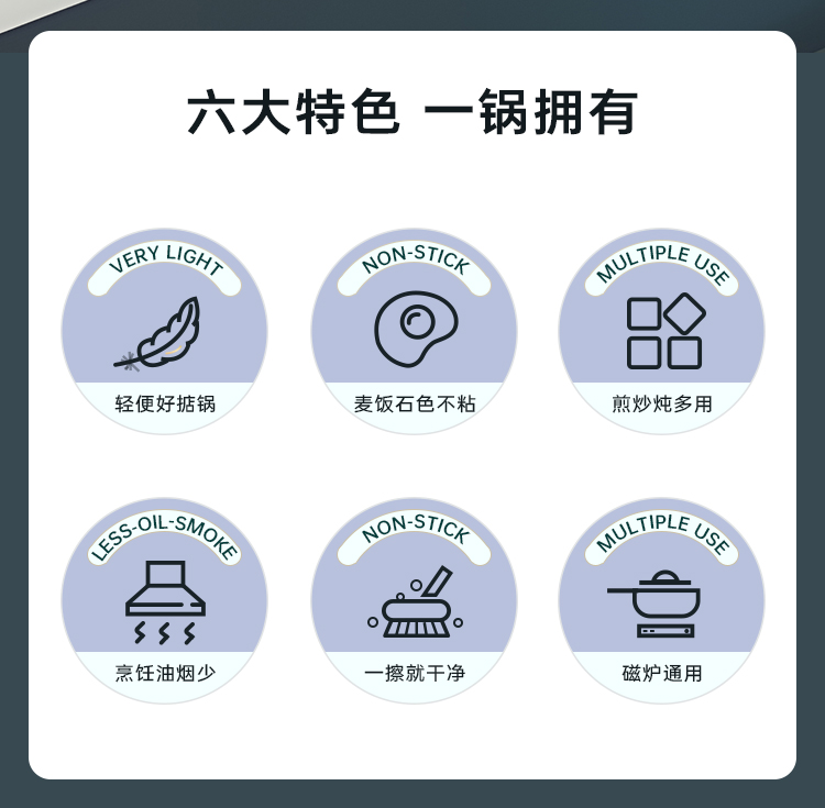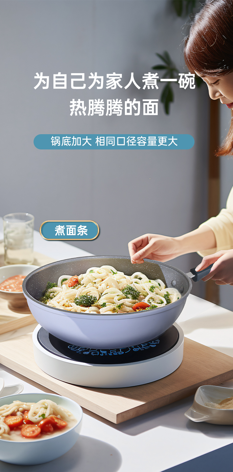 3、炉灶全兼容 换灶不换锅,高强度磁感应底,不挑炉灶更省心,经久不粘清洗更容易,不粘锅好清洗,省时更省力。