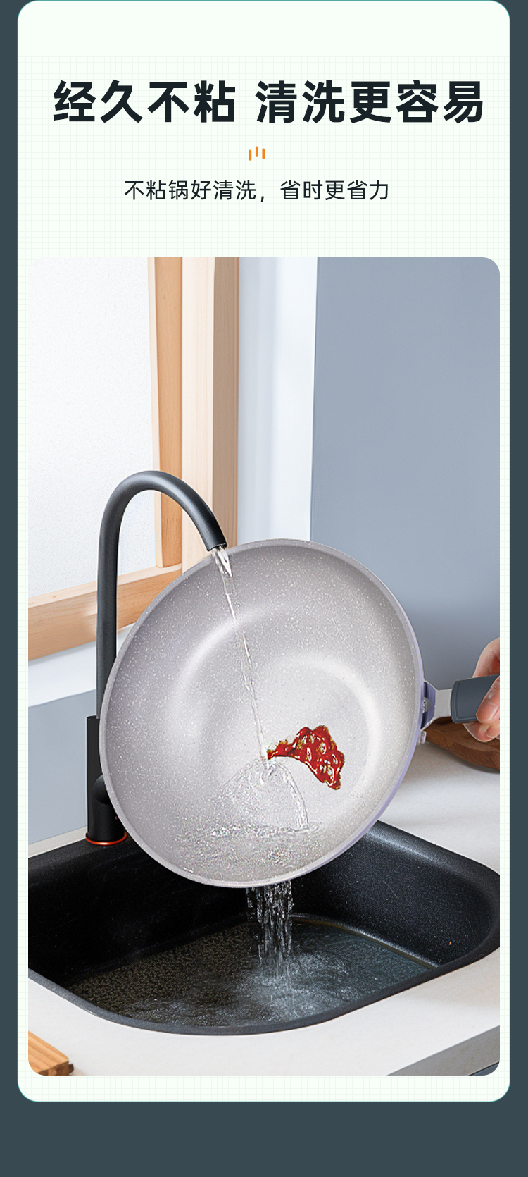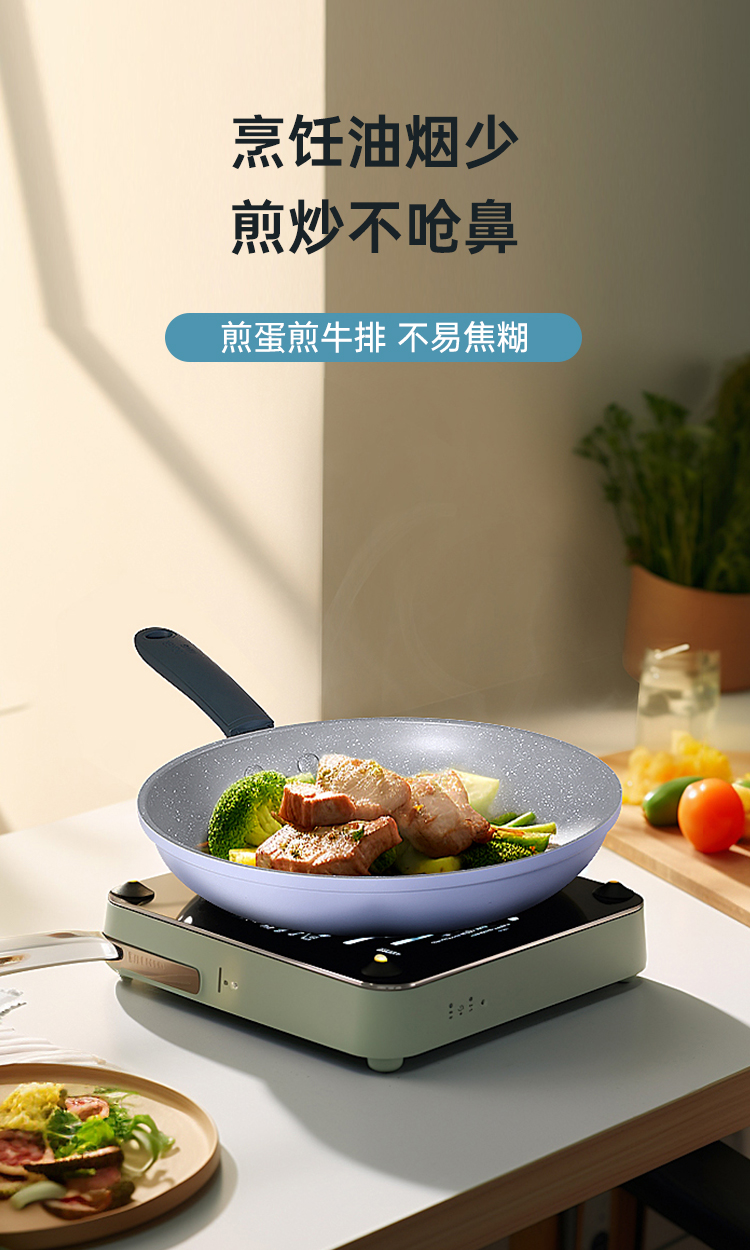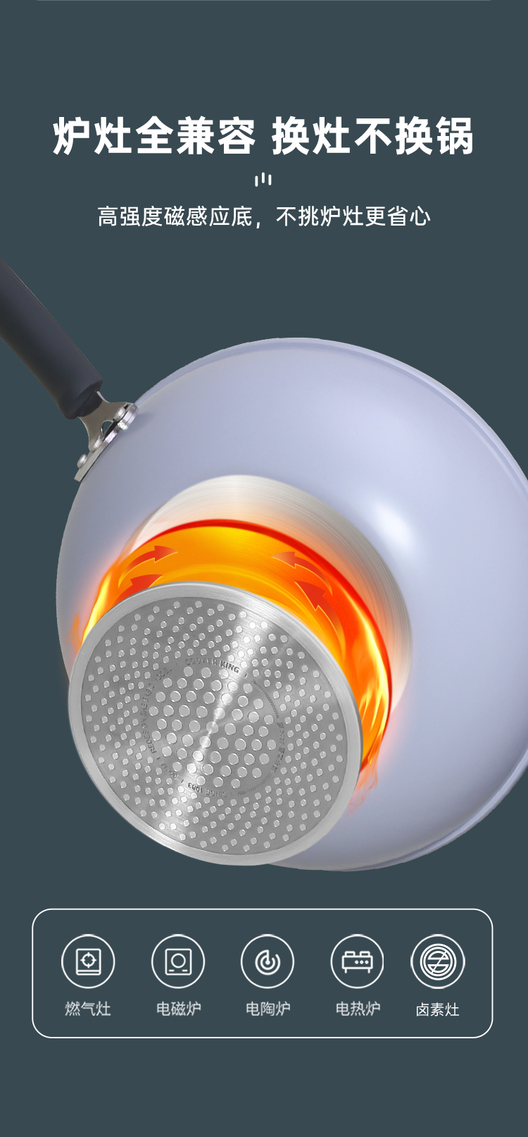 3、炉灶全兼容 换灶不换锅,高强度磁感应底,不挑炉灶更省心,经久不粘清洗更容易,不粘锅好清洗,省时更省力。
