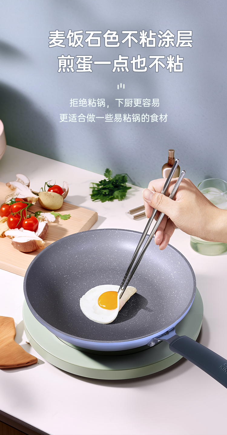 1、一口好锅要有好的使用体验,健康麦饭石色涂层,厚底薄壁,匀热控油。