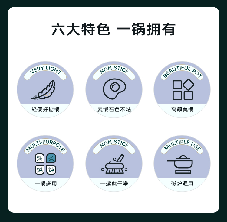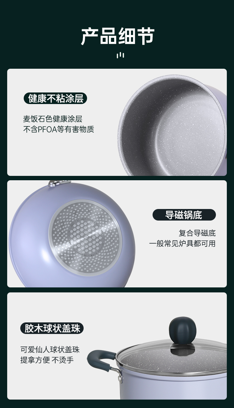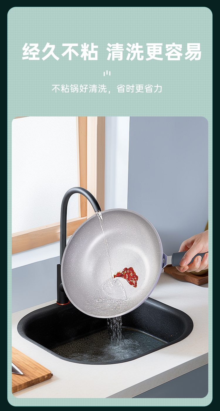 3、炉灶全兼容 换灶不换锅,高强度磁感应底,不挑炉灶更省心,经久不粘清洗更容易,不粘锅好清洗,省时更省力。