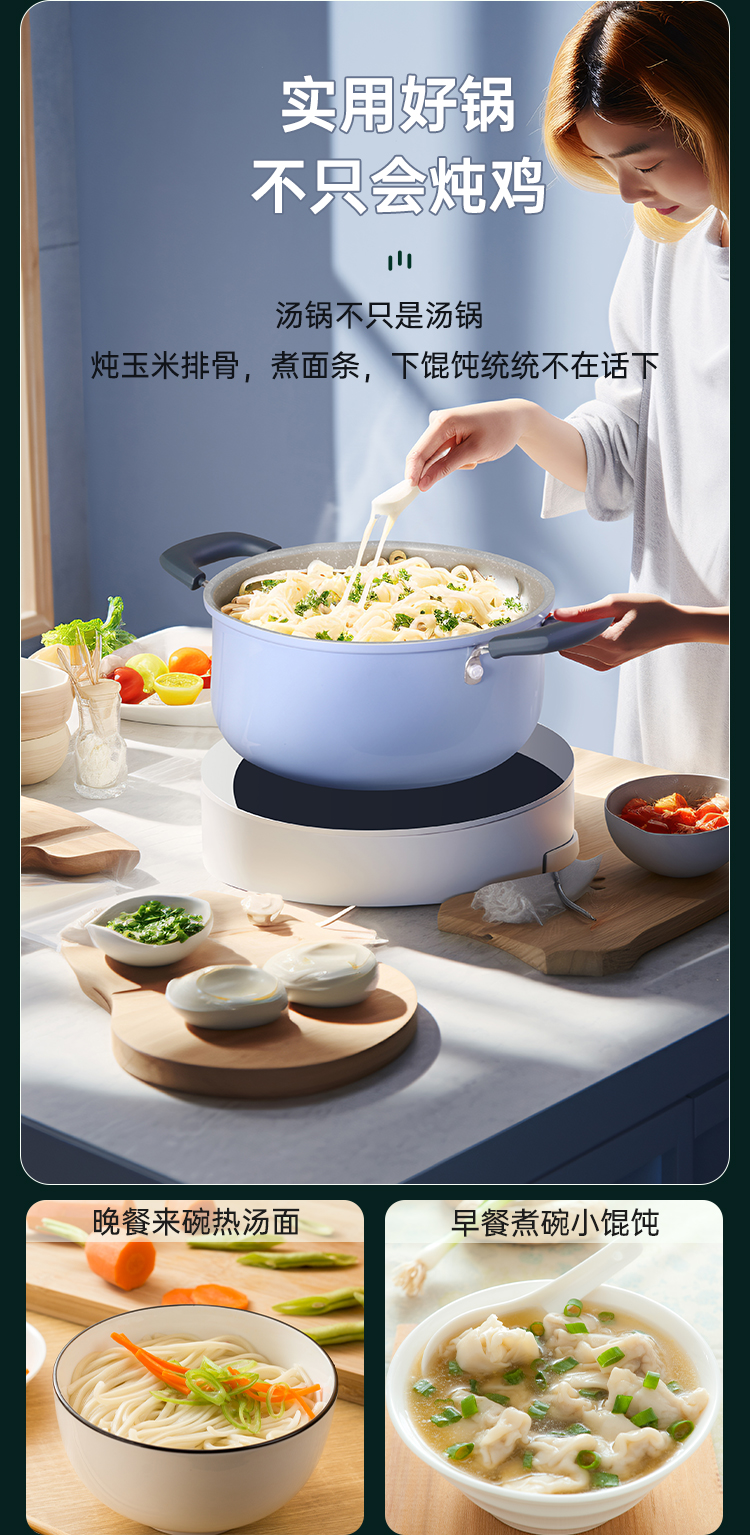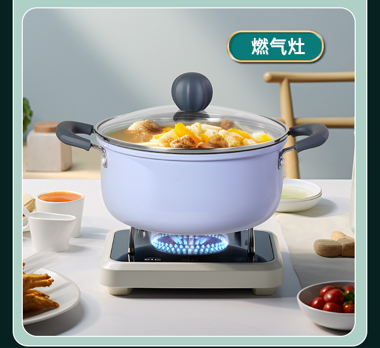 1、精致炖煮 始于颜值,浅蓝紫外观、麦饭石色涂层,健康不粘 美味加倍,一口锅可炖下一只鸡,全家享,实用好锅。