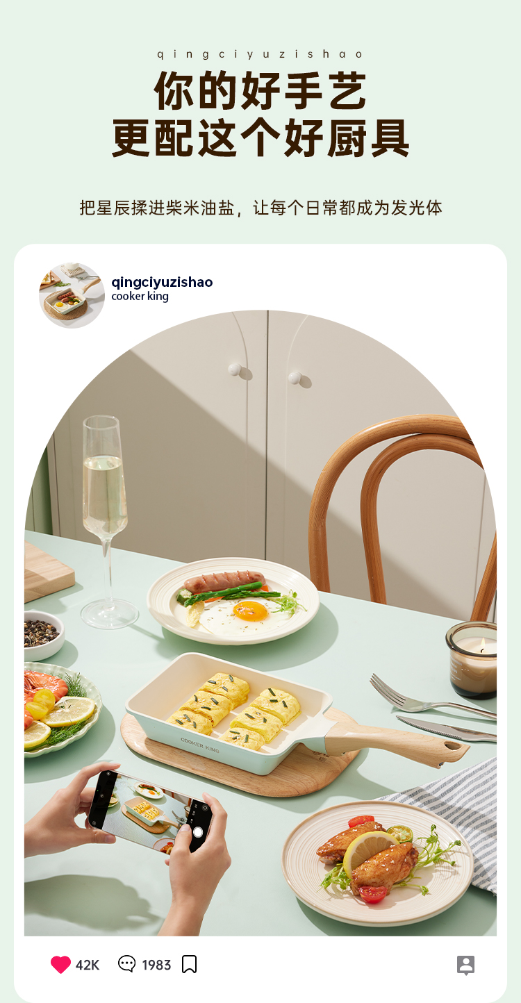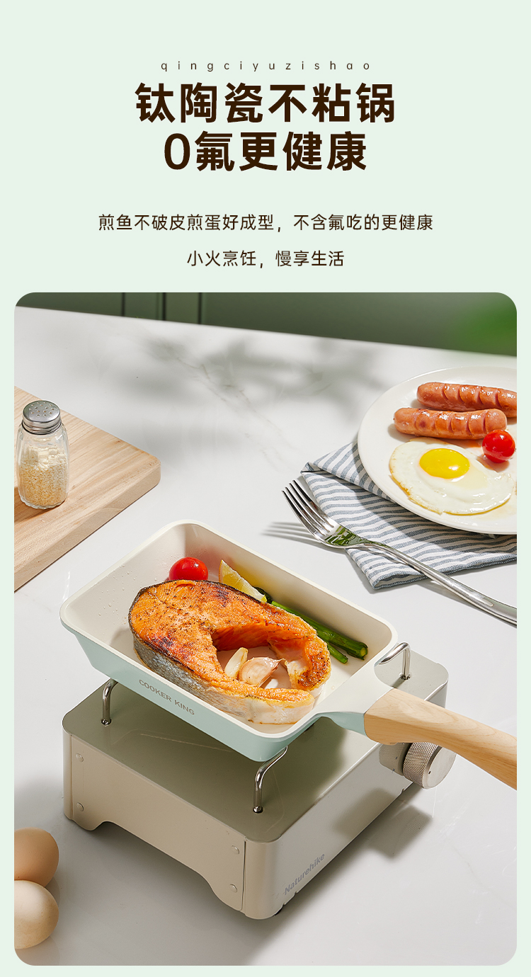 3、钛陶瓷不粘锅0氟更健康,煎鱼不破皮煎蛋好成型,不含氟吃的更健康小火烹饪,慢享生活。