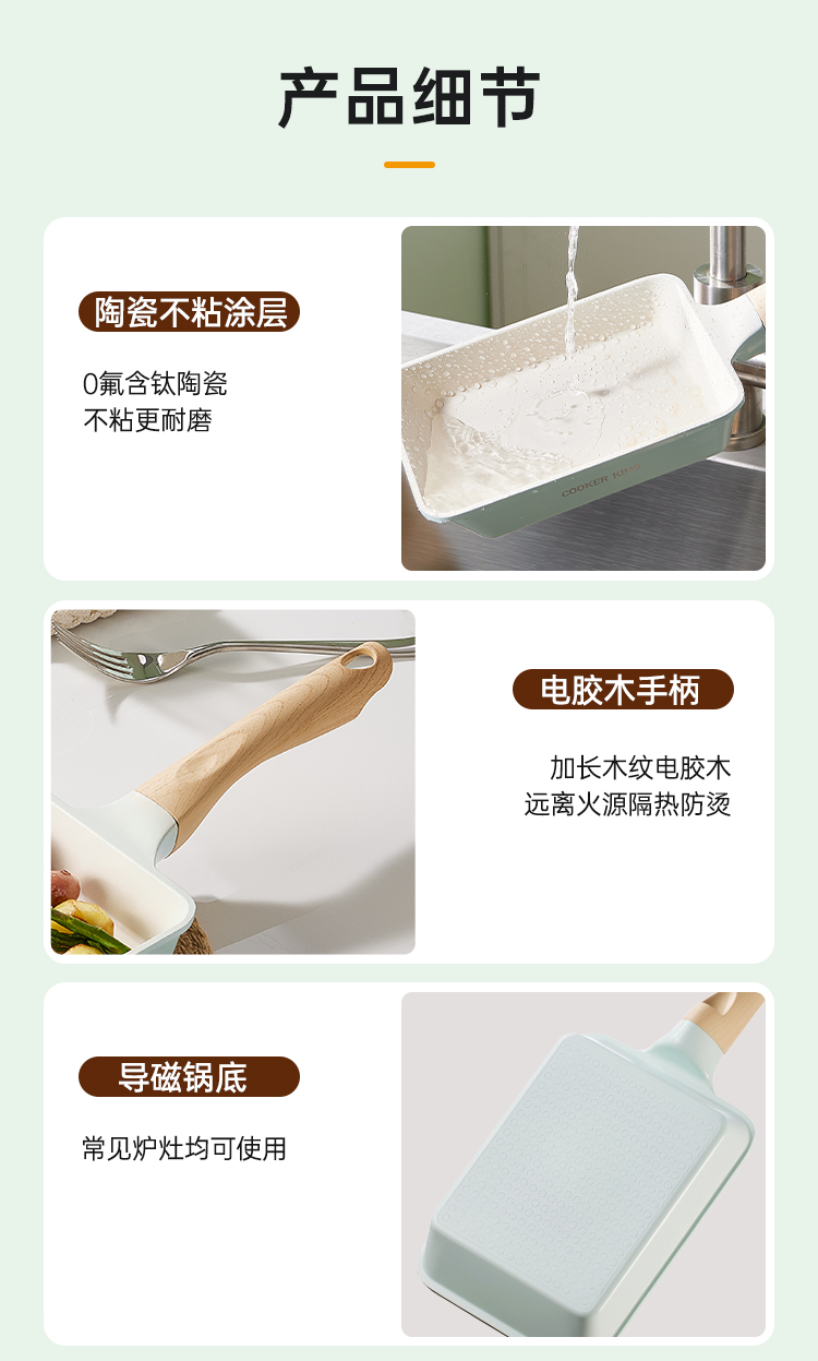 1、有钛陶瓷更健康卷出美味蛋烧,内外不粘一体压铸耐磨好洗。