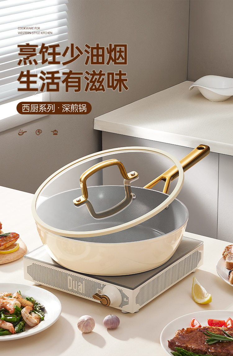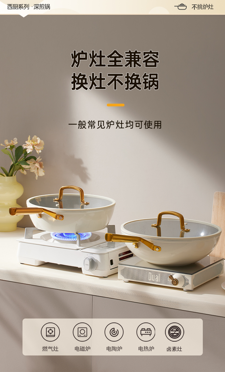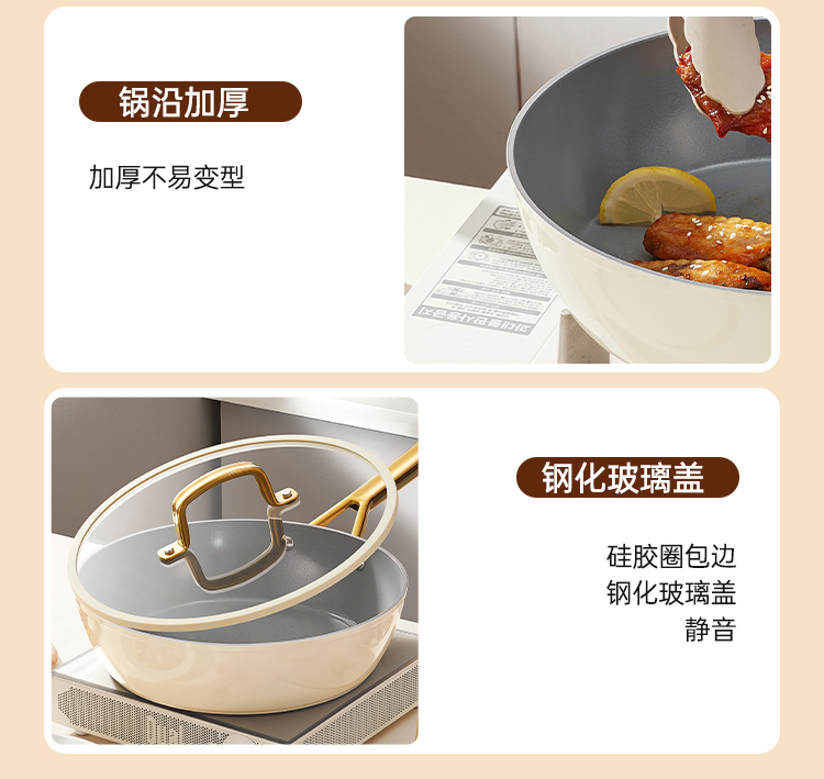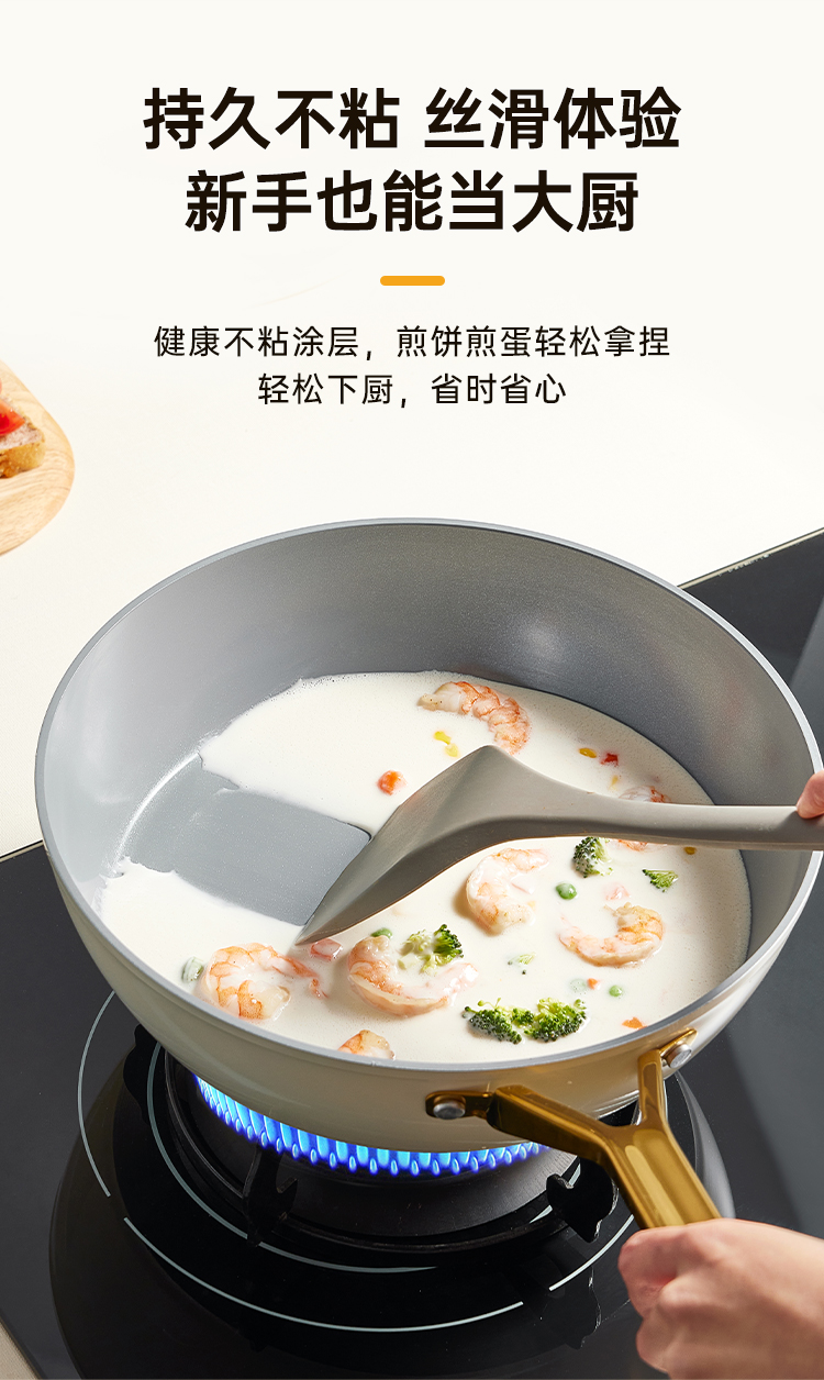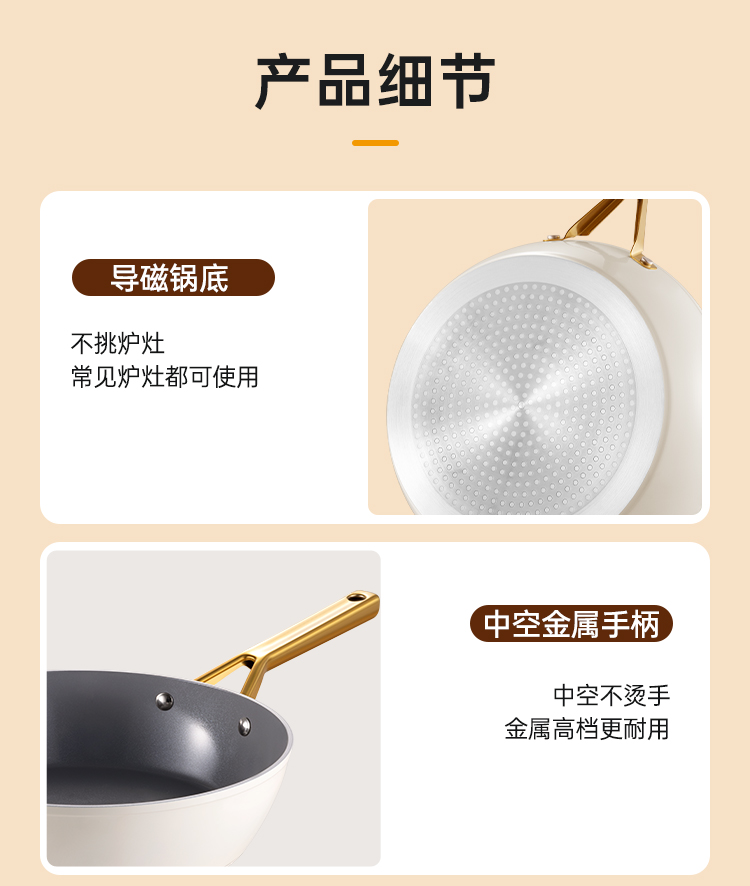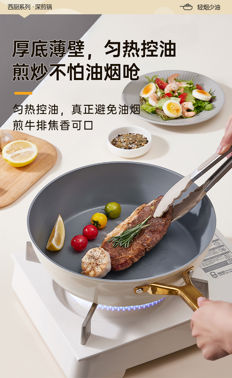 2、厚底薄壁,匀热控油,煎炒不怕油烟呛,炉灶全兼容换灶不换锅,持久不粘清洗容易餐后清洁更省时。