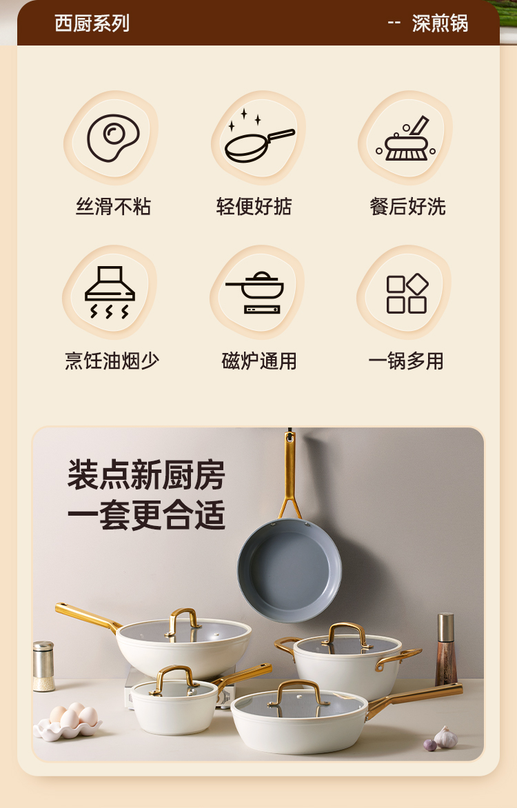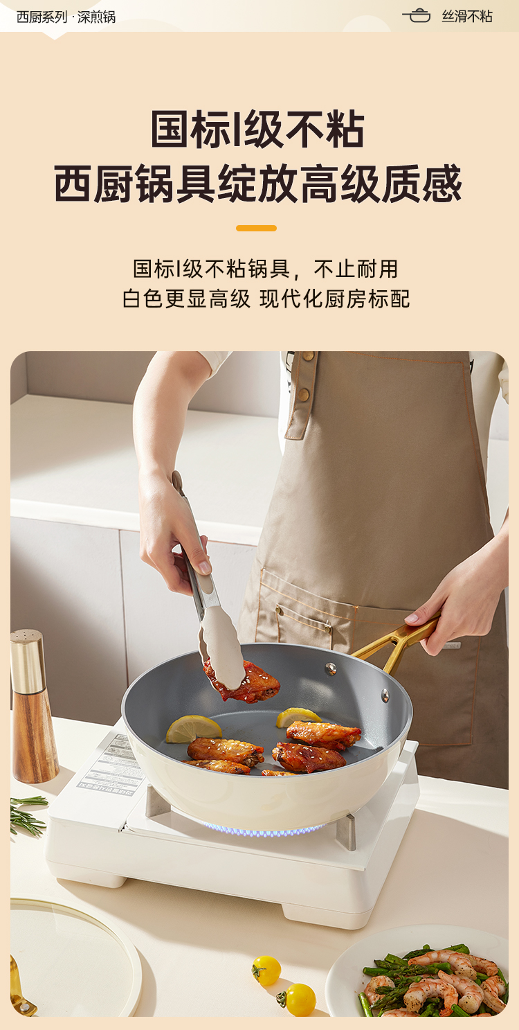 1、国标I级不粘锅具,不止耐用白色更显高级 现代化厨房标配,健康不粘涂层,煎饼煎蛋轻松拿捏轻松下厨,省时省心。