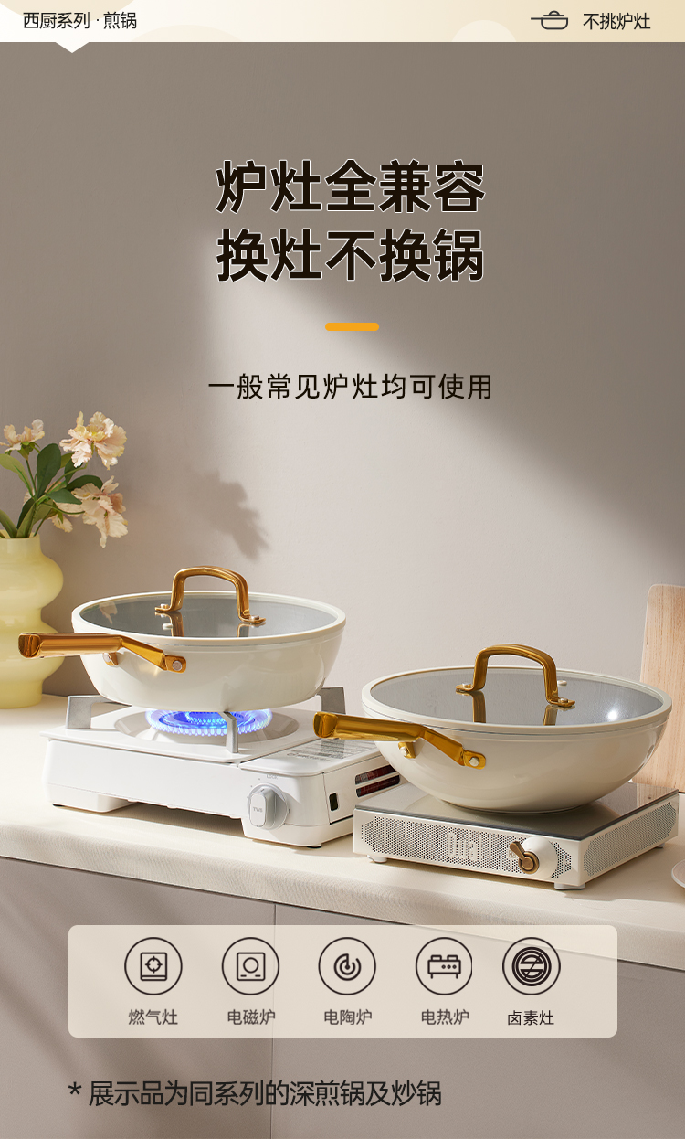 2、厚底薄壁,匀热控油,煎炒不怕油烟呛,炉灶全兼容换灶不换锅,持久不粘清洗容易餐后清洁更省时。