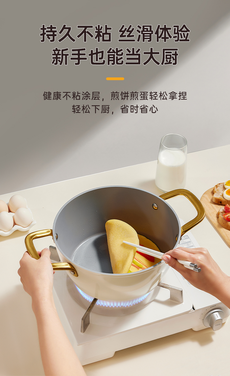 1、国标I级不粘锅具,不止耐用白色更显高级 现代化厨房标配,健康不粘涂层,煎饼煎蛋轻松拿捏轻松下厨,省时省心。