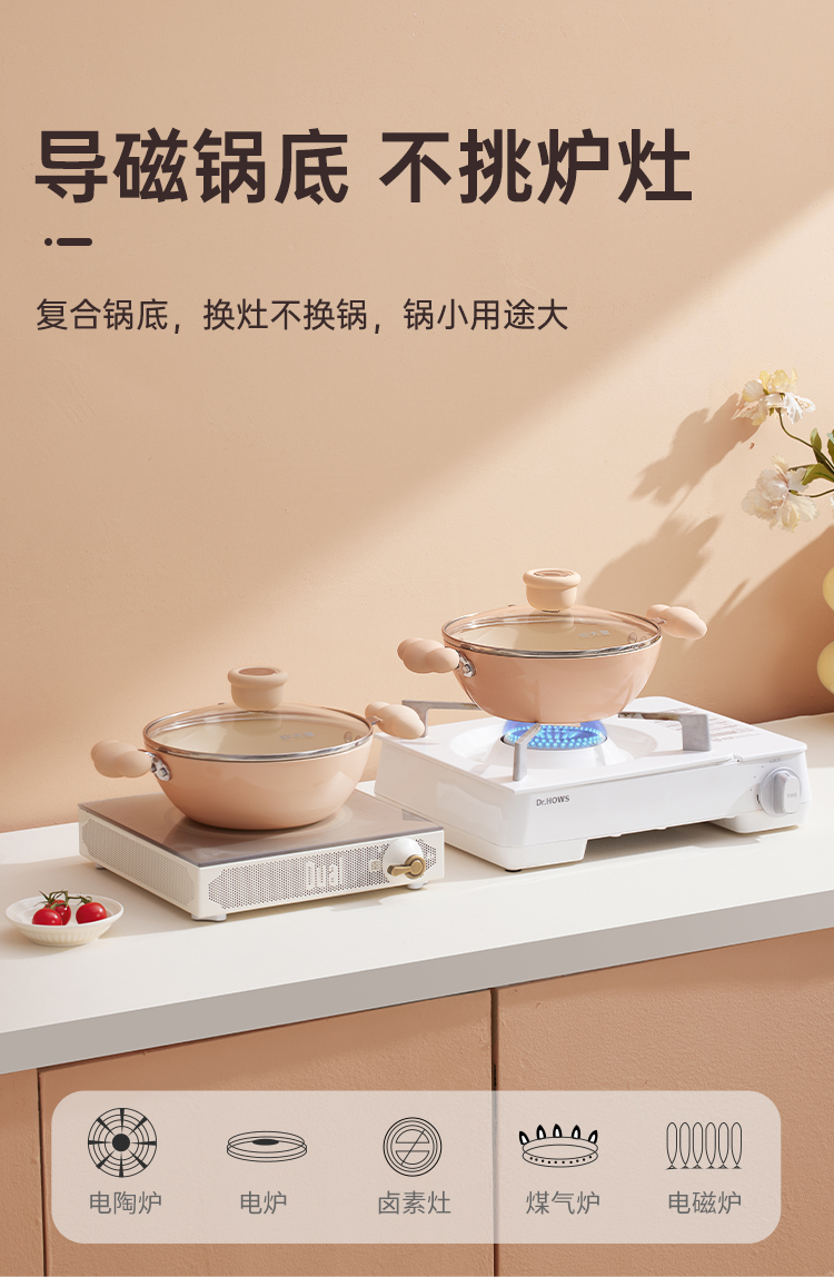 3、随锅赠送贴心硅胶盖,耐冷耐热,材质健康,复合锅底,换灶不换锅,锅小用途大