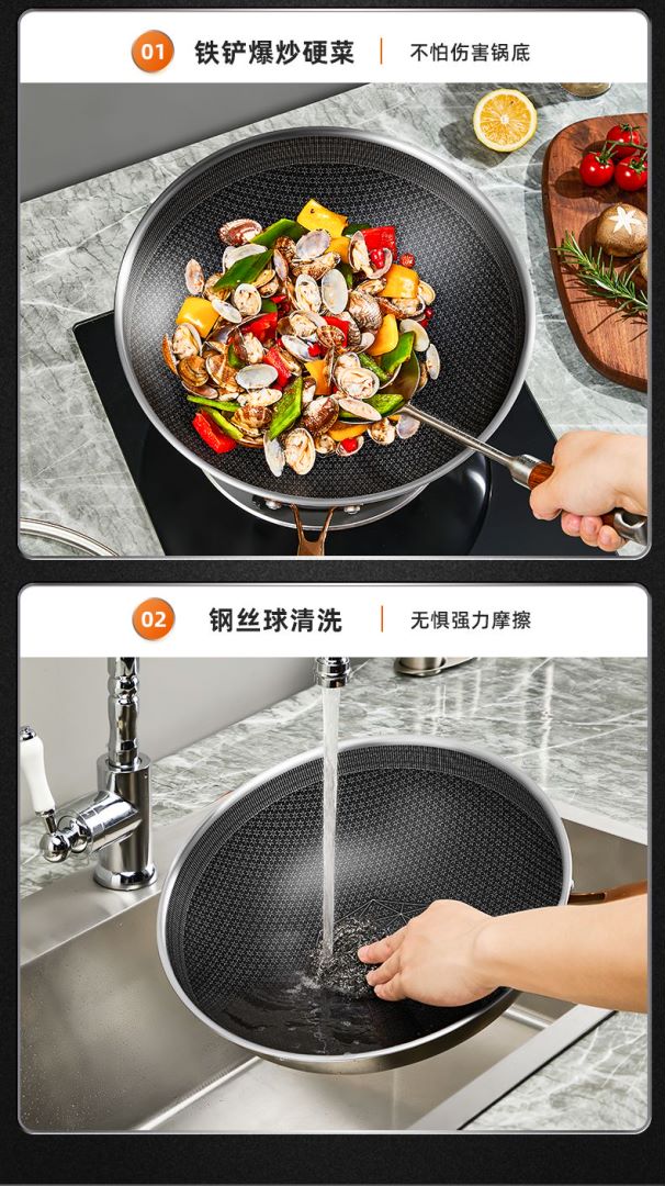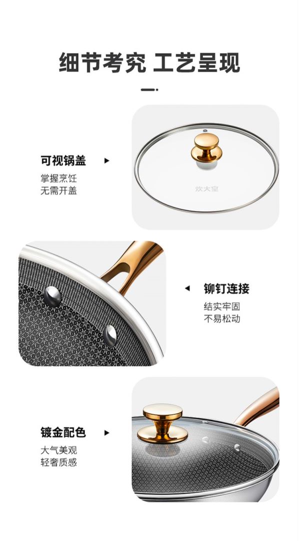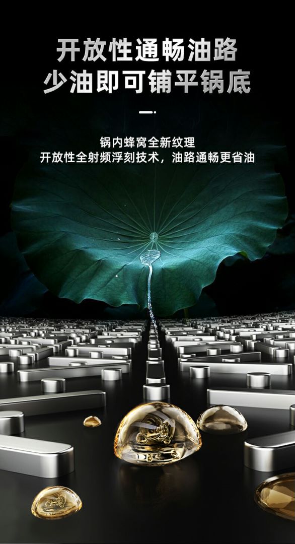 1、加深蜂窝纹防粘实力派,锅内蜂窝全新纹理开放性,全射频浮刻技术,油路通畅更省油。