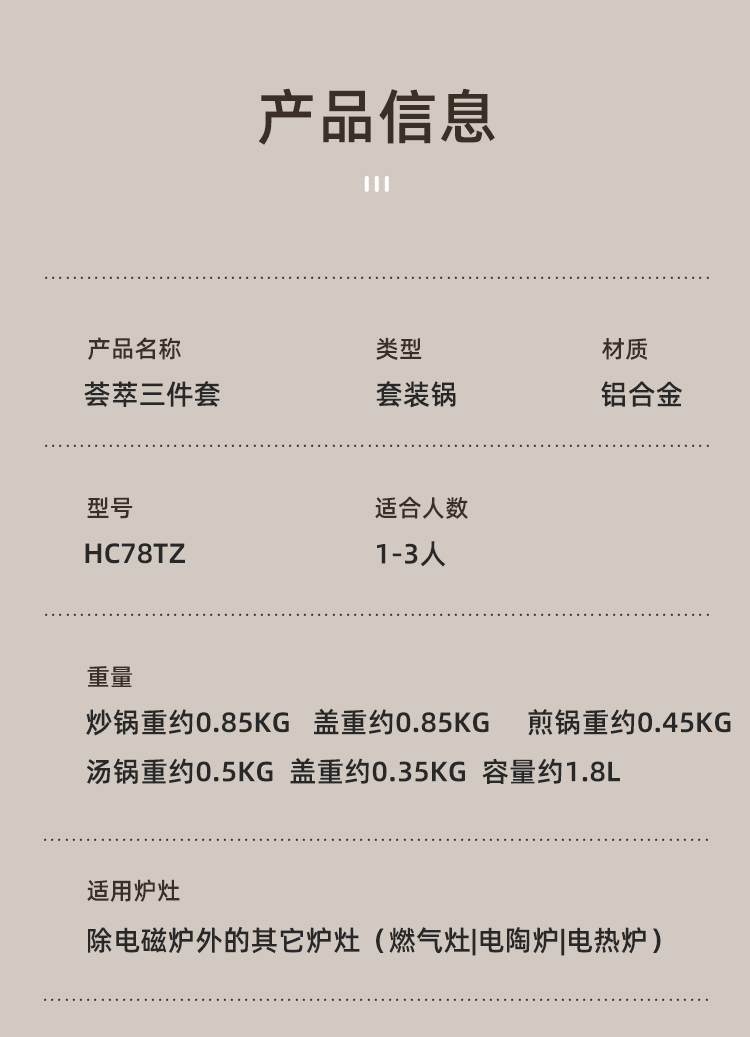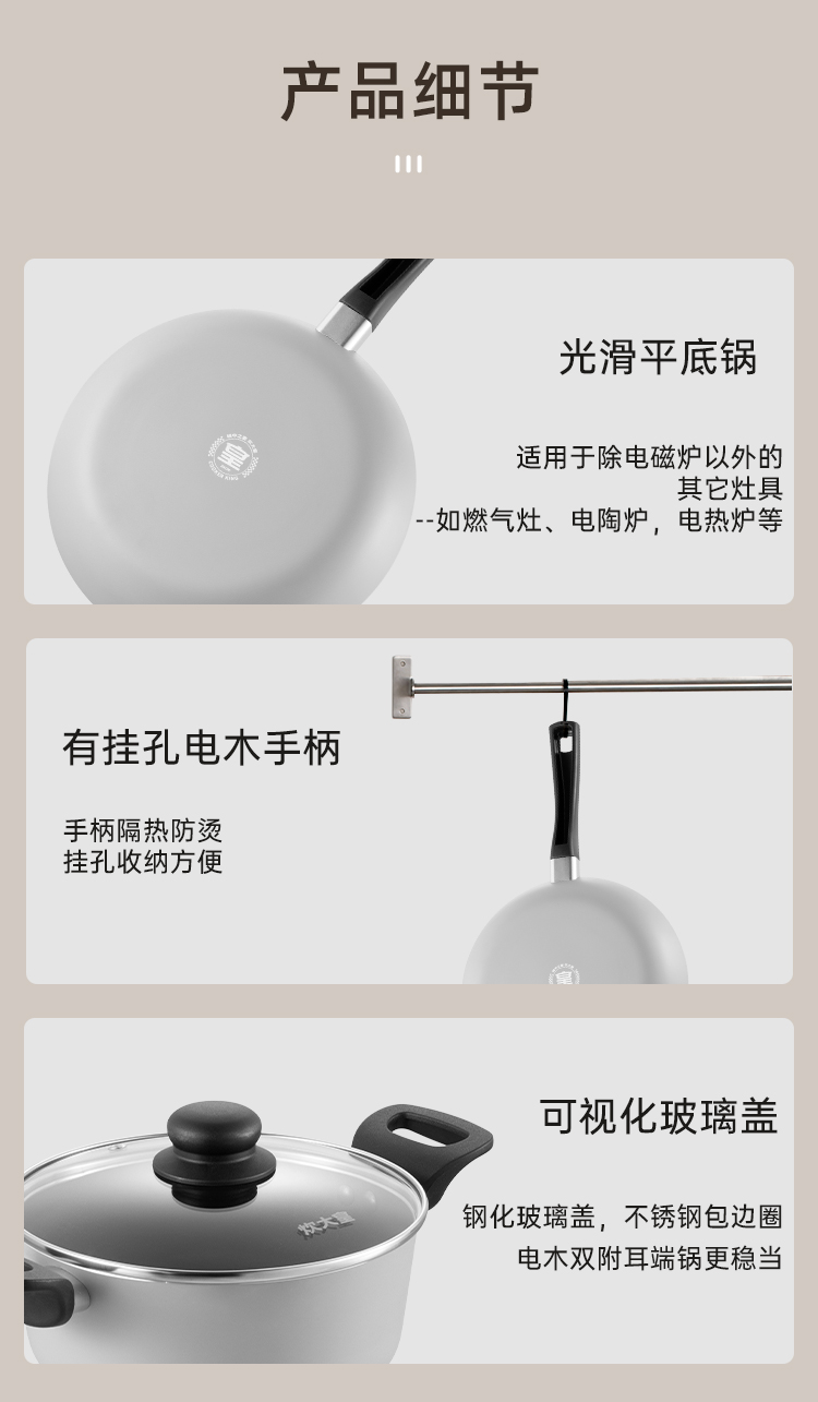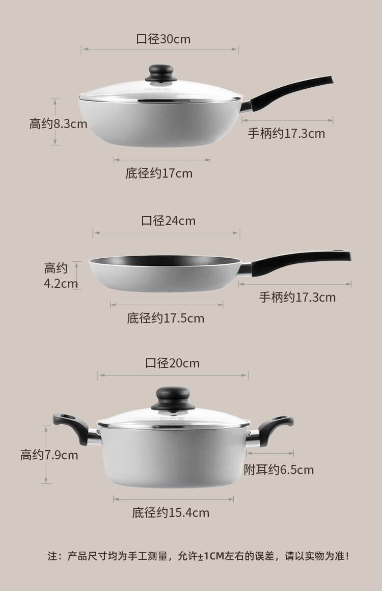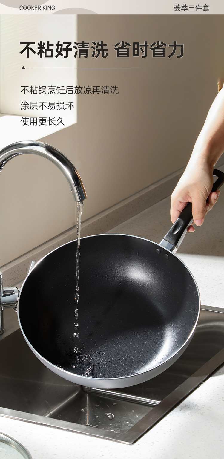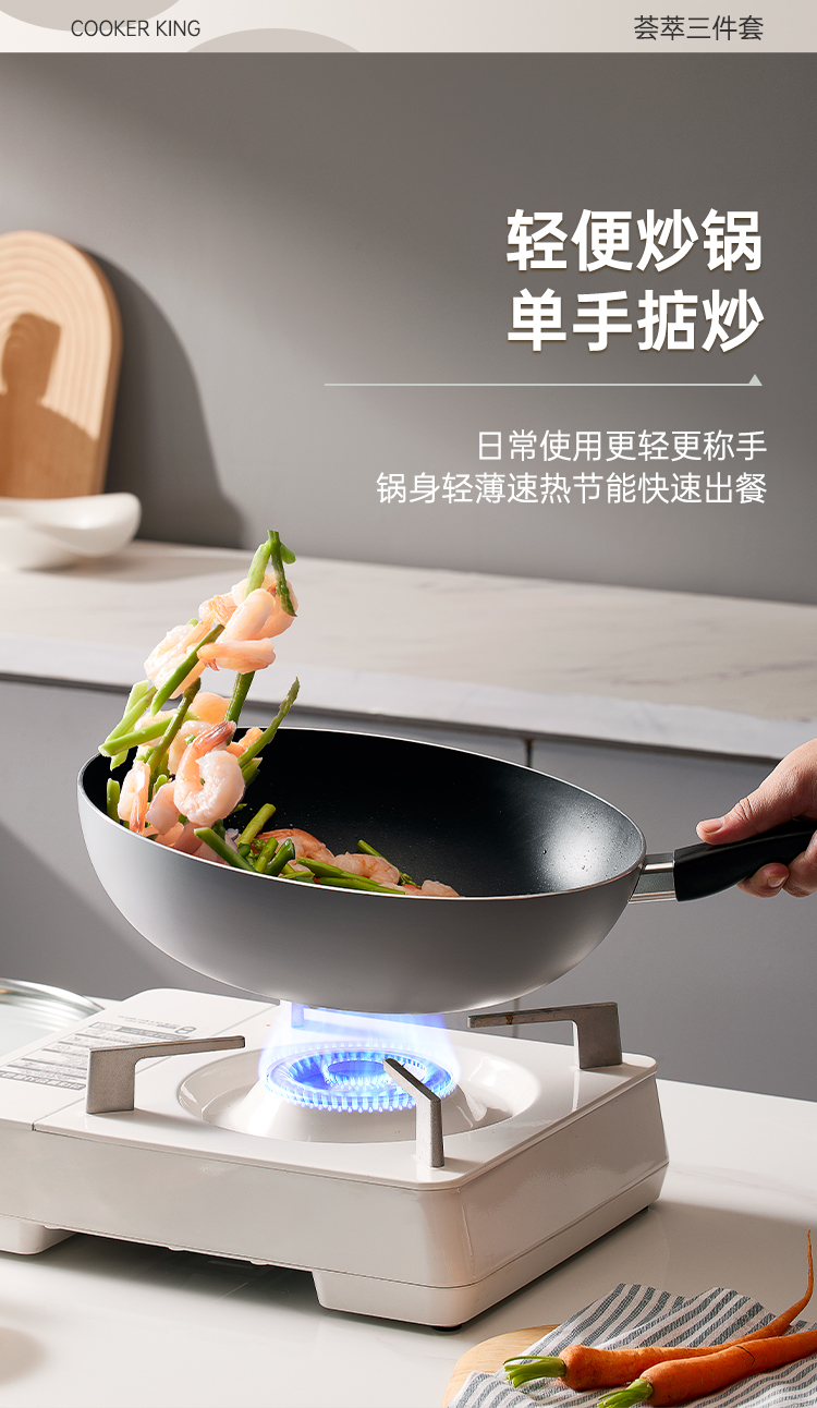 1、家庭实用款轻便不粘三件套,煎炒焖煮炸一套都搞定。